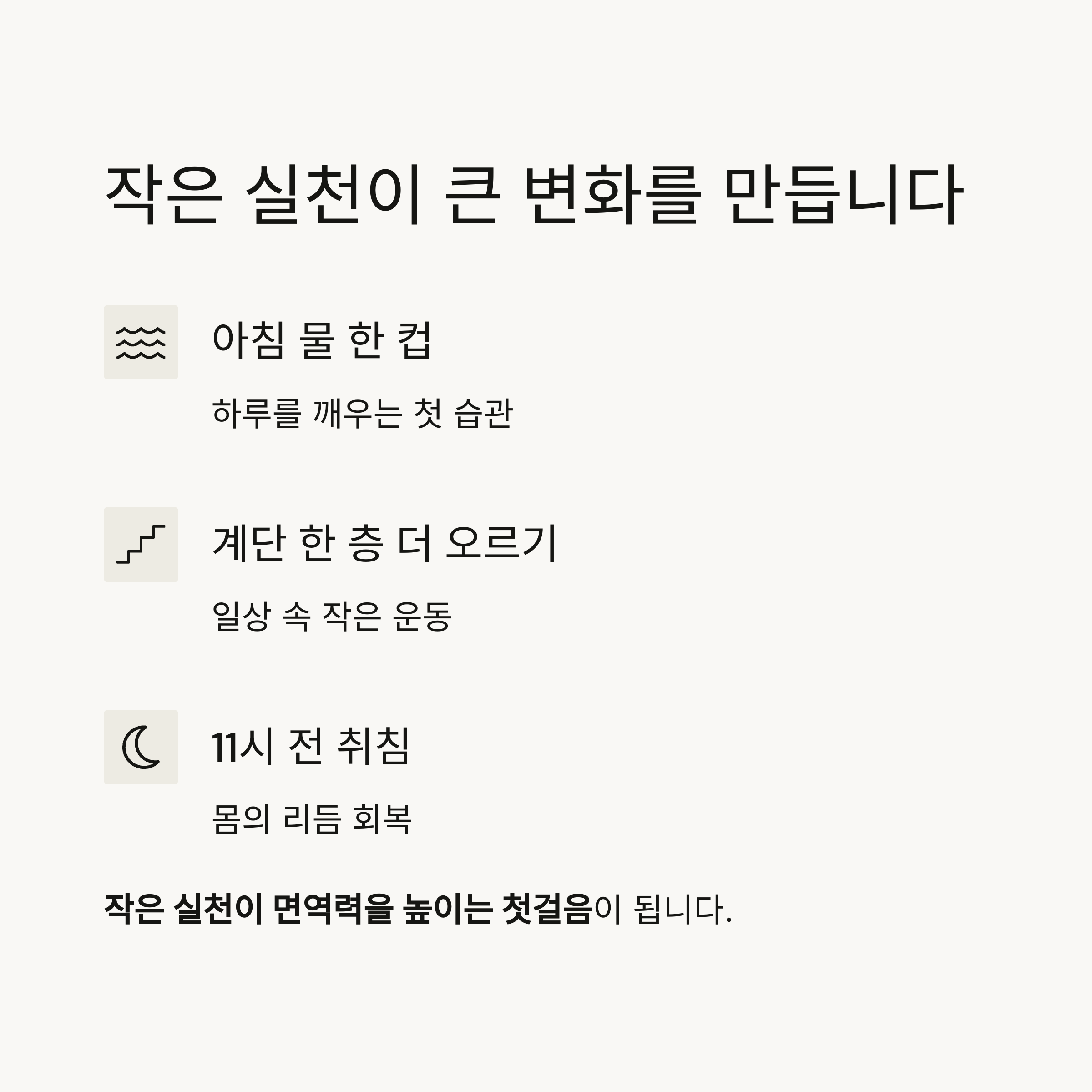 이런 사소한 실천이 몸의 리듬을 회복시키고, 면역력을 높이는 첫걸음이 됩니다.