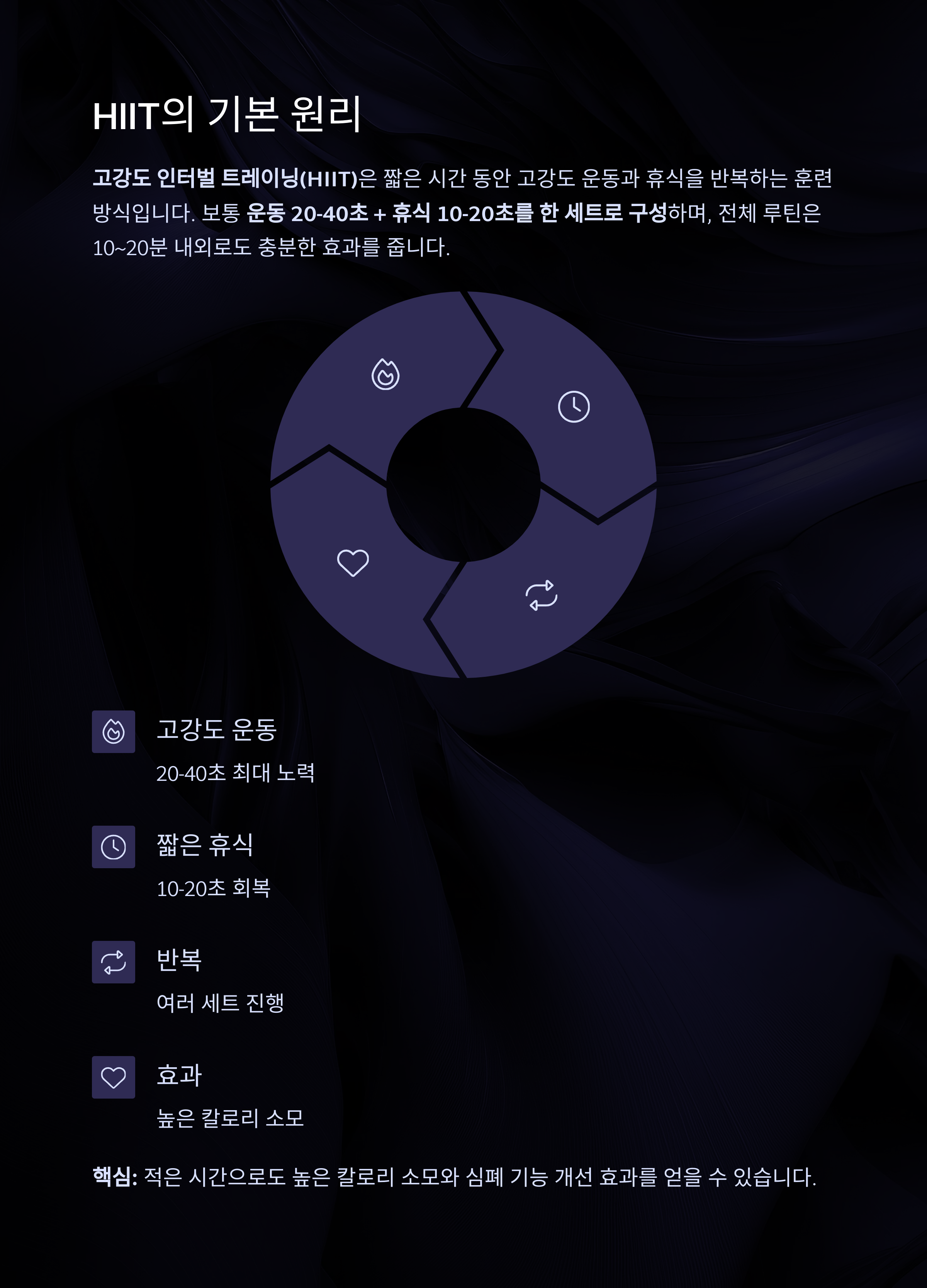 핵심: 적은 시간으로도 높은 칼로리 소모와 심폐 기능 개선 효과를 얻을 수 있습니다.