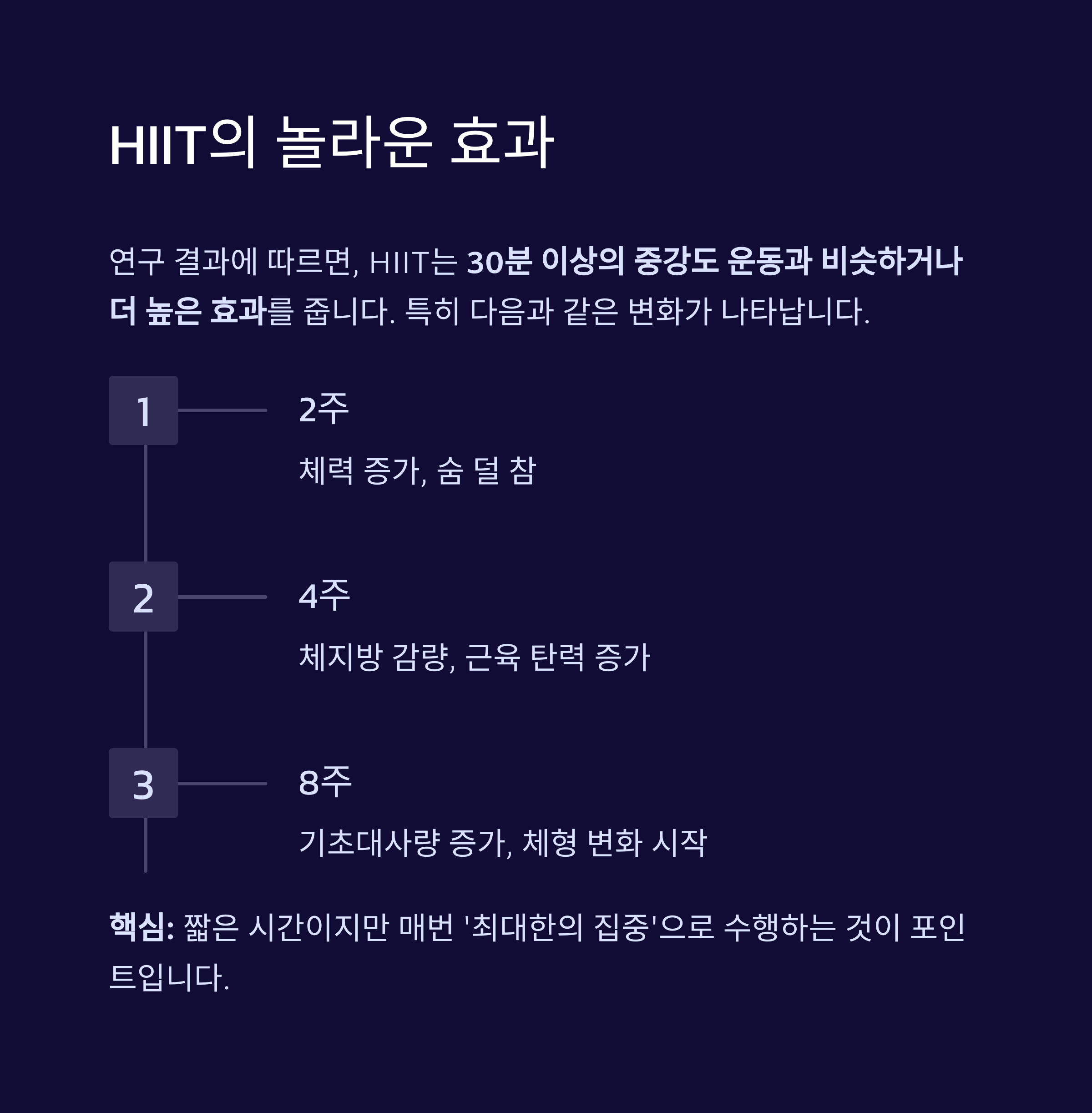 연구 결과에 따르면, HIIT는 30분 이상의 중강도 운동과 비슷하거나 더 높은 효과를 줍니다.