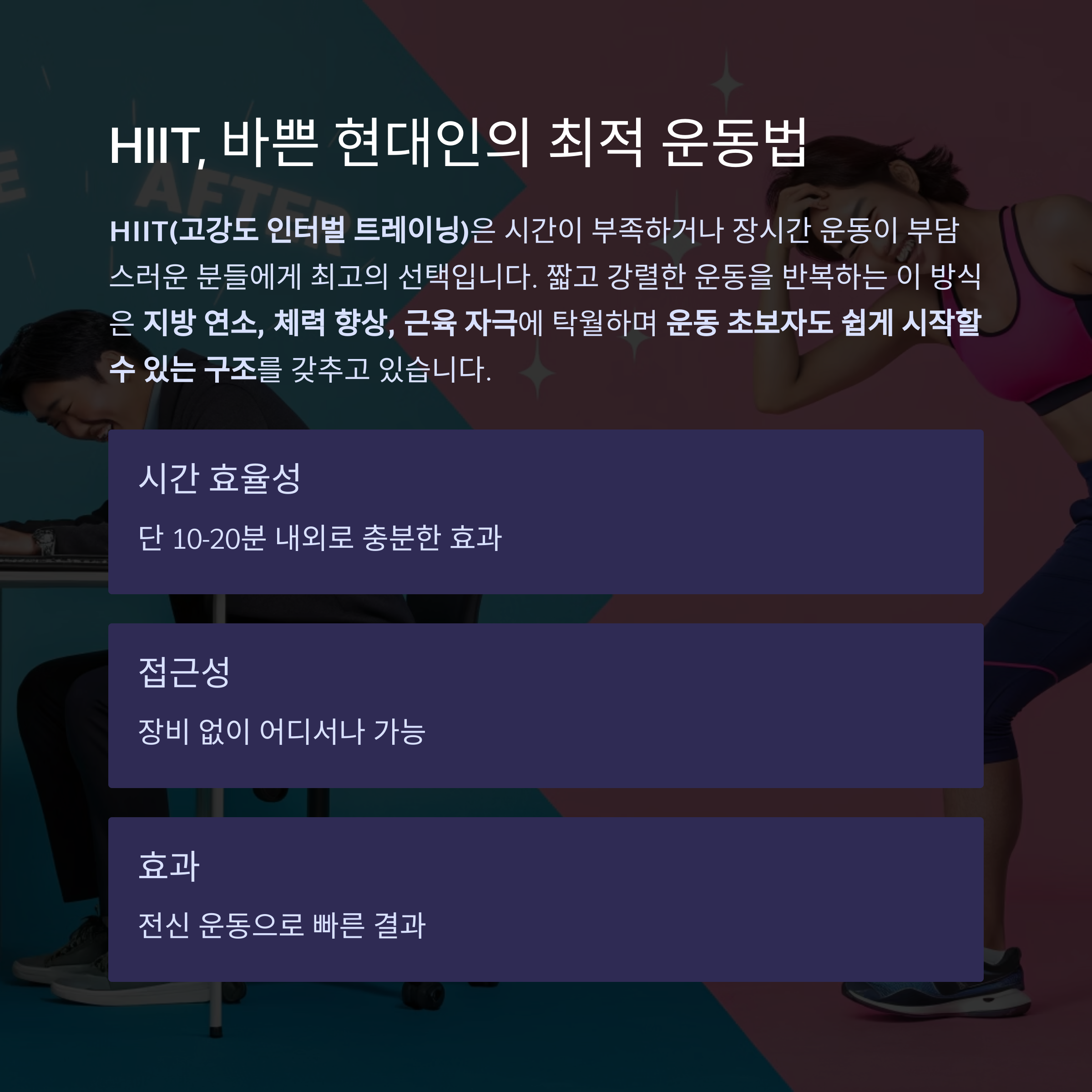 장시간 운동이 부담스러운 분들에게 **HIIT(고강도 인터벌 트레이닝)**은 최고의 선택입니다.