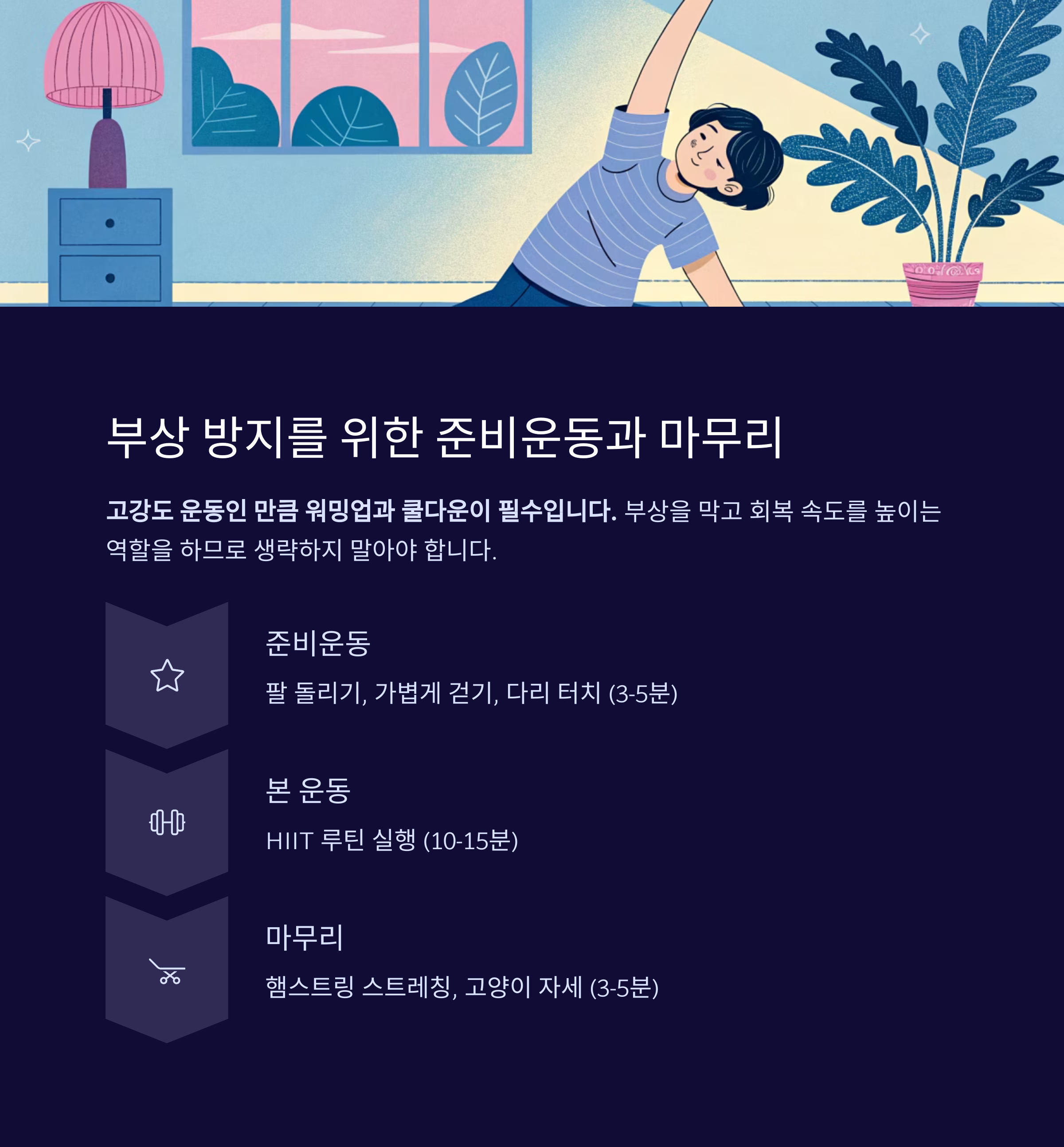부상을 막고 회복 속도를 높이는 역할을 하므로 생략하지 말아야 합니다.
