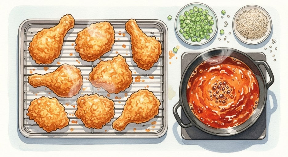 만약 좀 더 특별한 맛을 원한다면, 닭강정 소스를 직접 만들어 버무려보는 건 어떨까요?