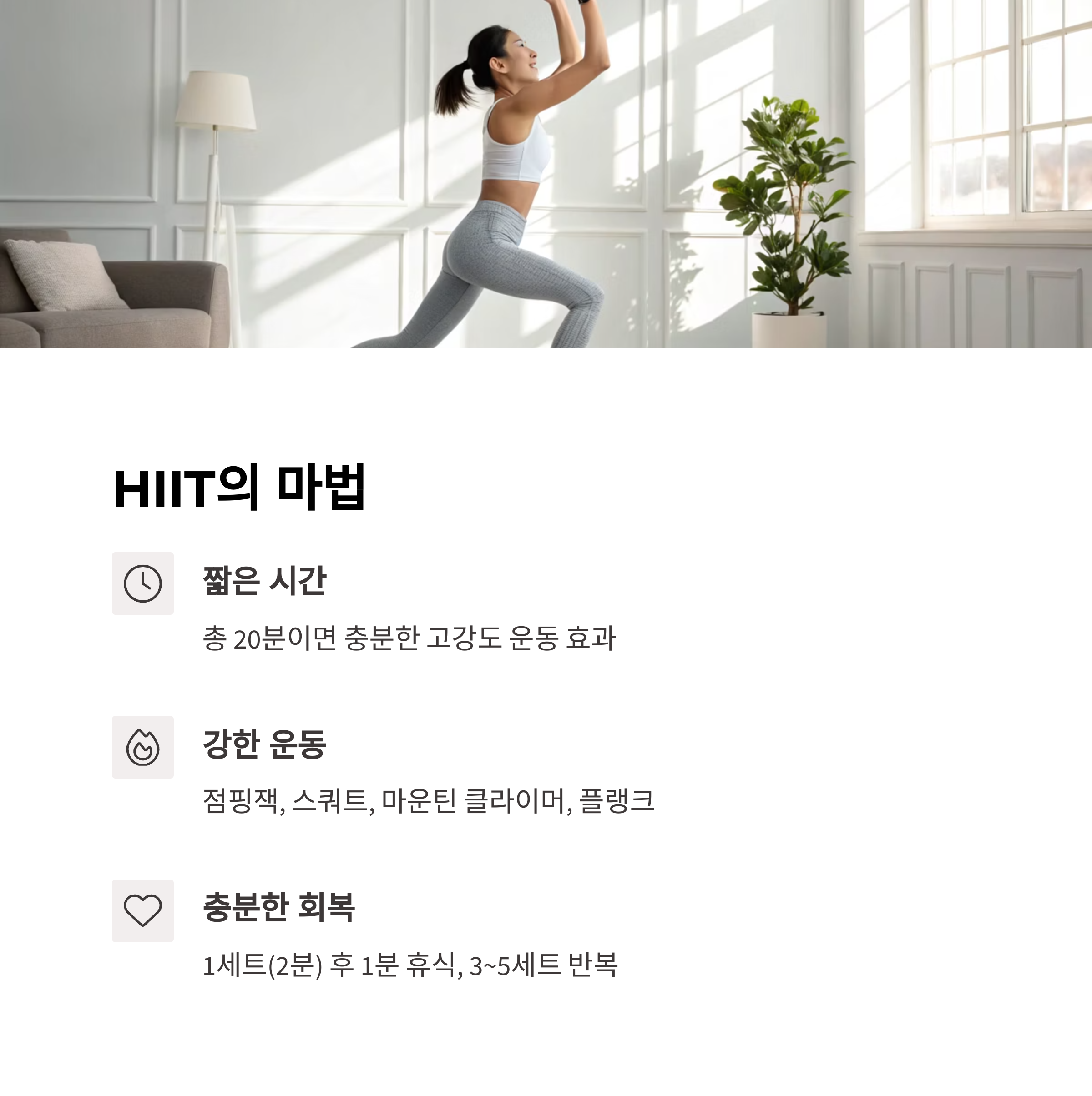 이 세 가지가 결합된 HIIT는 운동기구 없이도 최고의 체지방 감량 효과를 줍니다