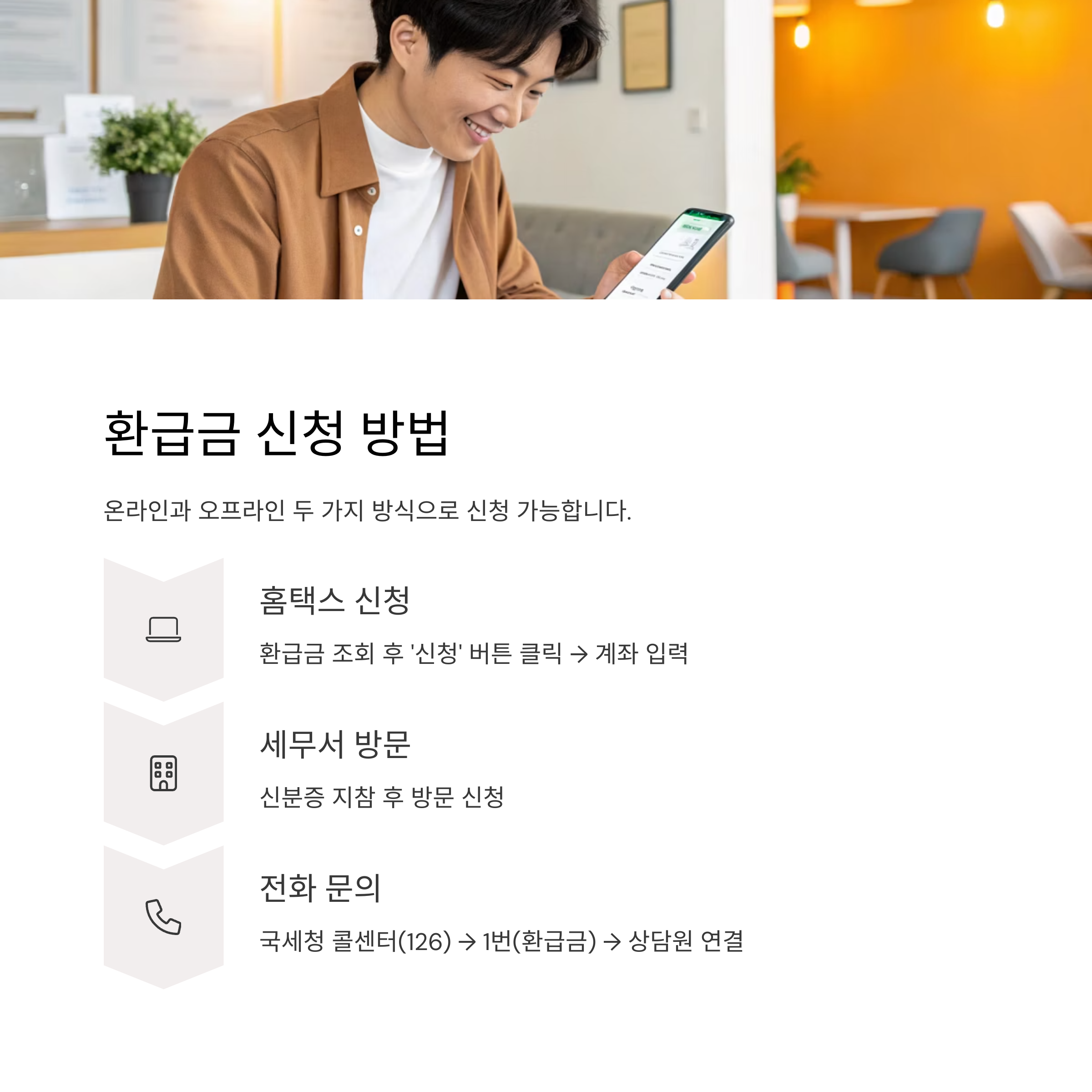 | 전화 문의 | 국세청 콜센터(126) → 1번(환급금) → 상담원 연결 |