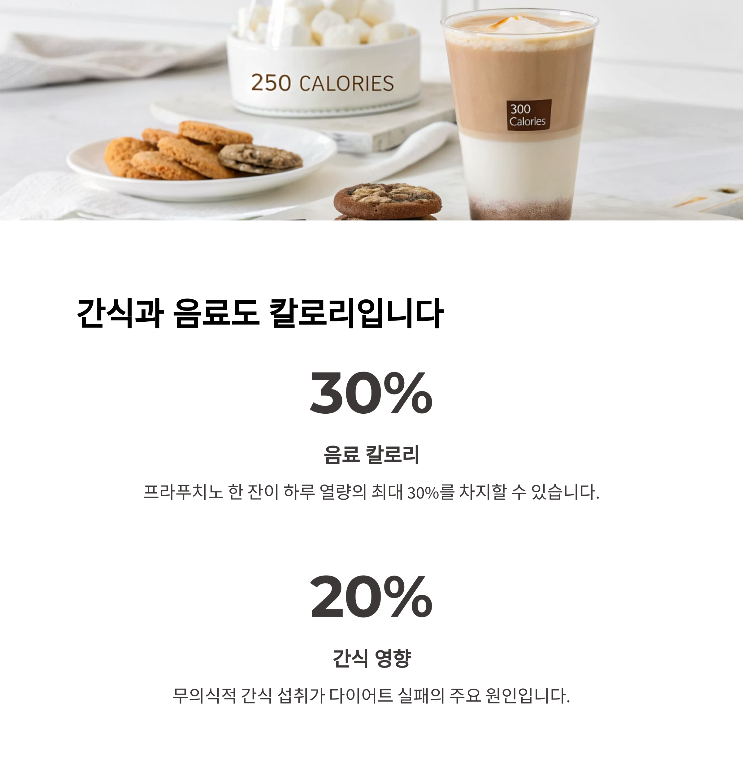 하지만 프라푸치노 한 잔, 초콜릿 몇 개가 하루 열량의 20~30%를 차지할 수 있습니다.