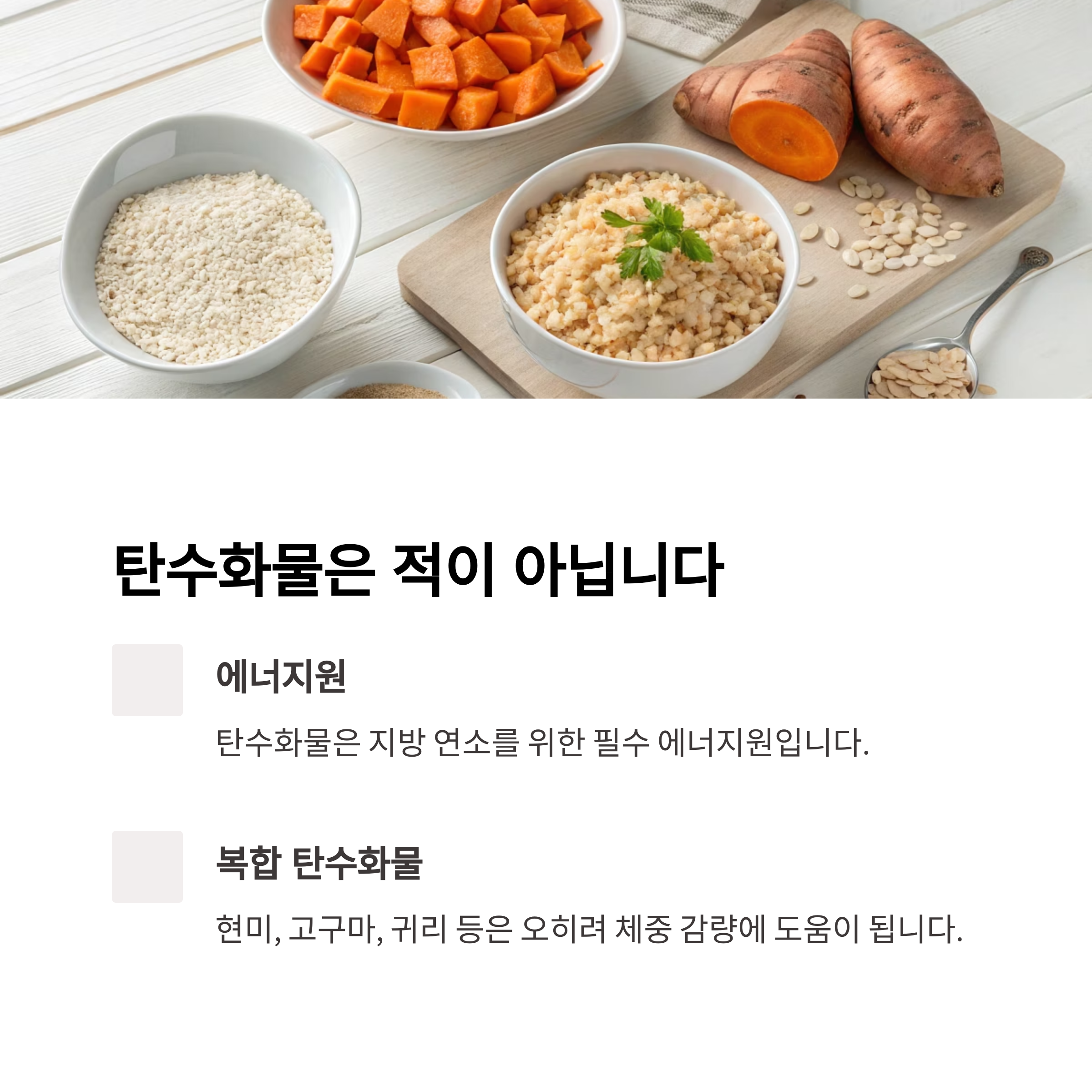 복합 탄수화물(현미, 고구마, 귀리 등)은 오히려 체중 감량에 도움이 됩니다.