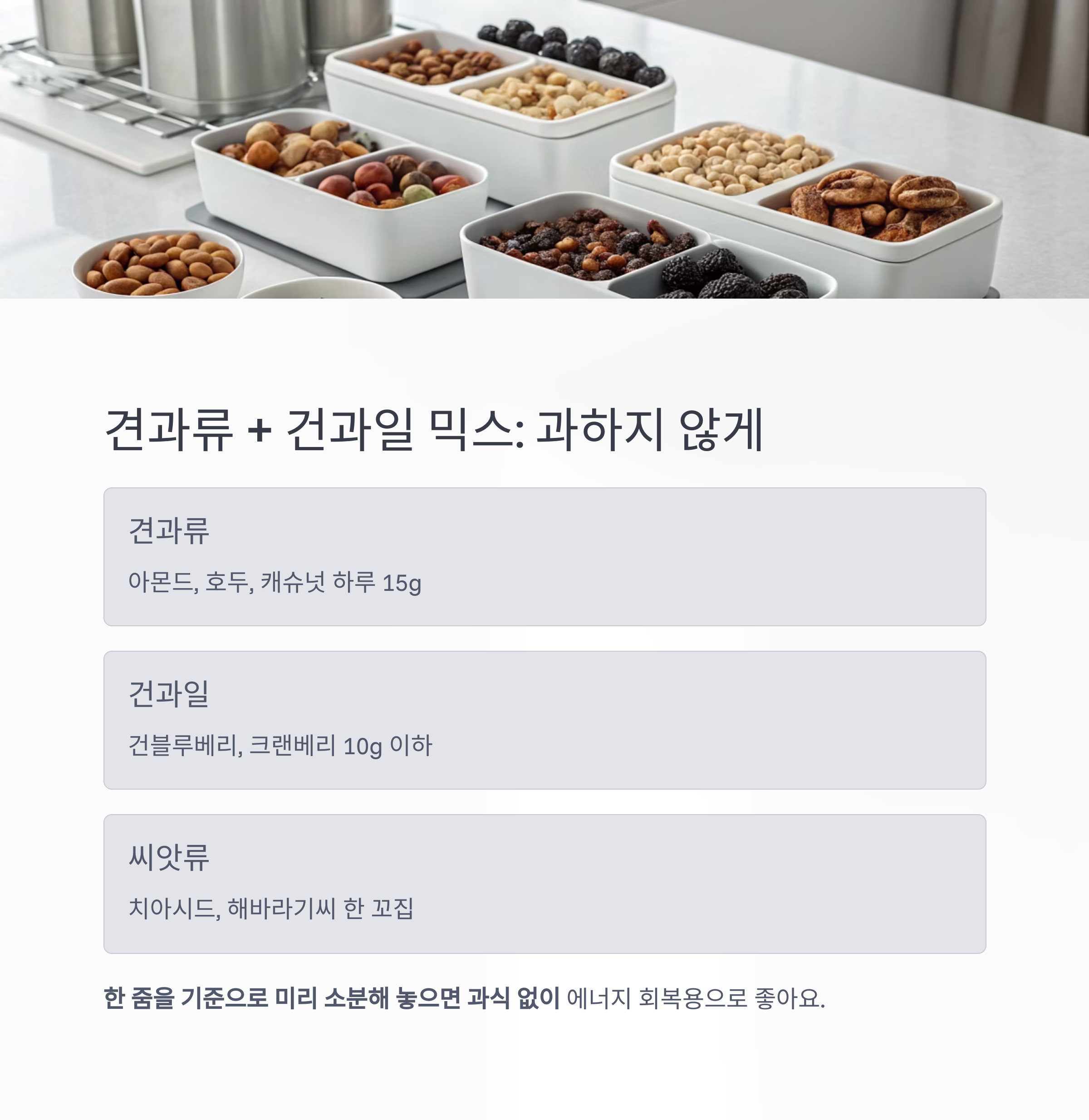 견과류 + 건과일 믹스: 간편하지만 과하지 않게