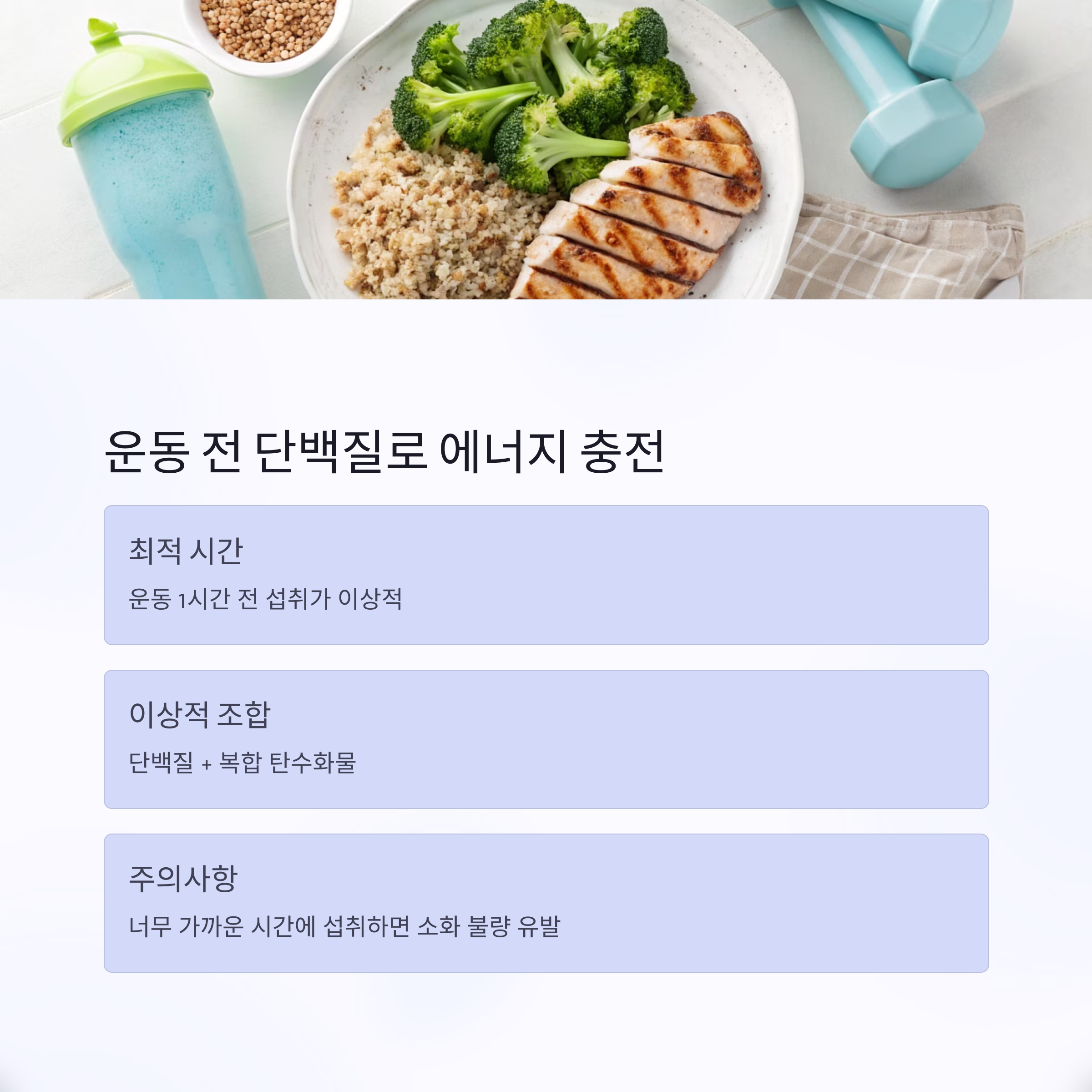 | 운동 1시간 전 | 에너지 보충, 근육 보호 | 복합 식단 + 단백질 |