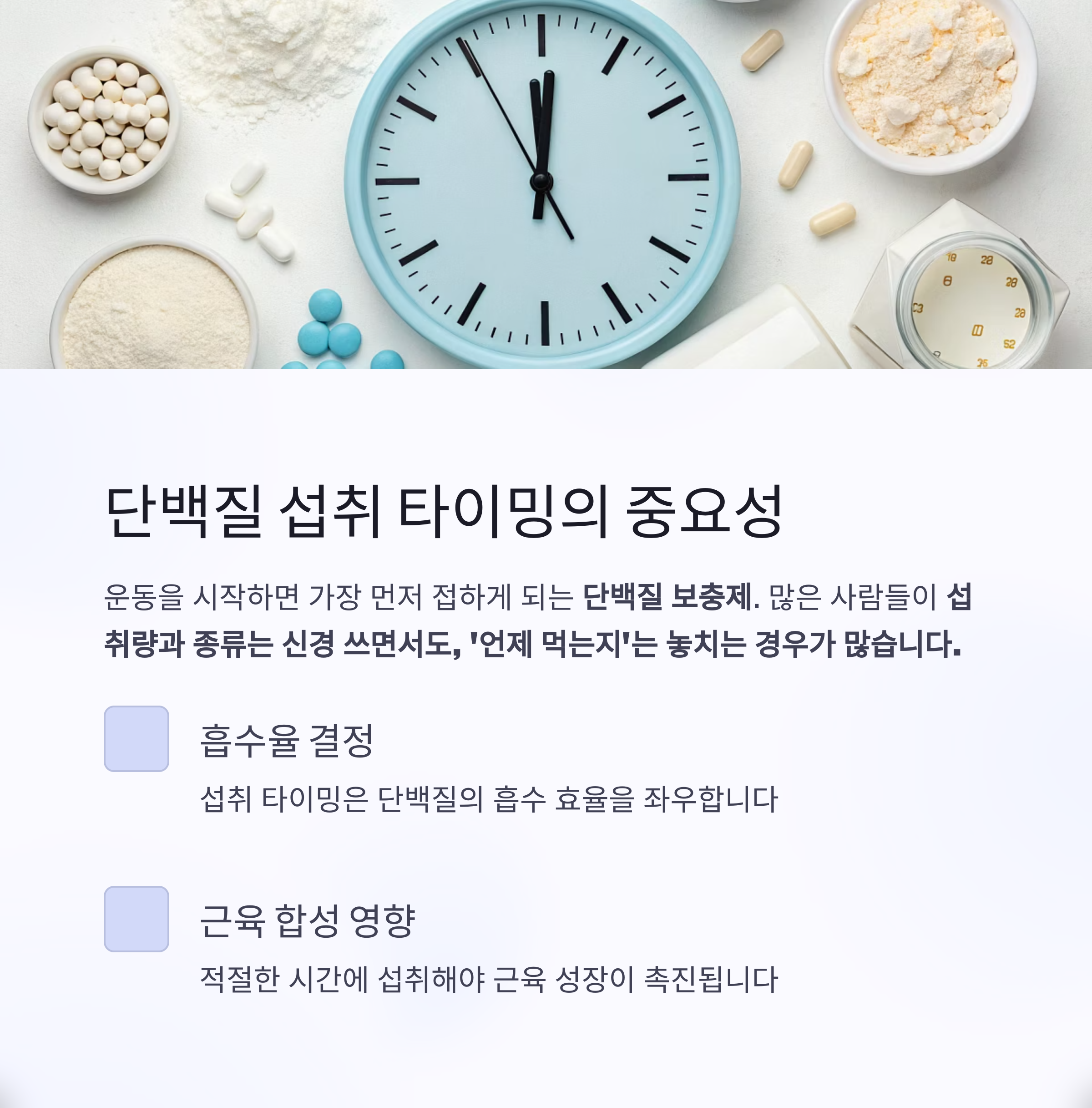섭취 타이밍은 단백질의 흡수율과 근육 합성 효과를 좌우하는 핵심 요소입니다.