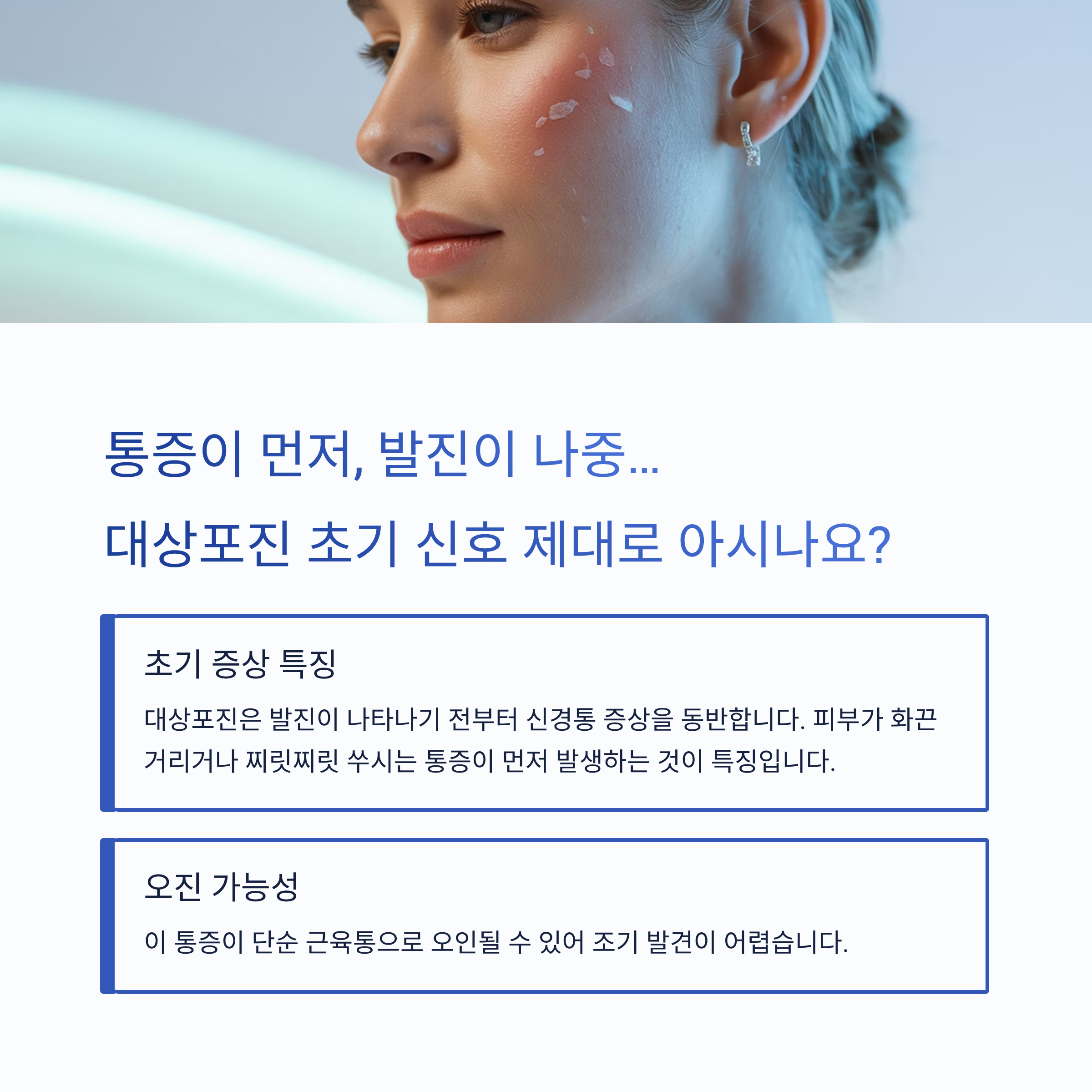 대상포진 초기 증상은 "통증이 먼저, 발진이 나중"이라는 점을 기억해야 합니다.