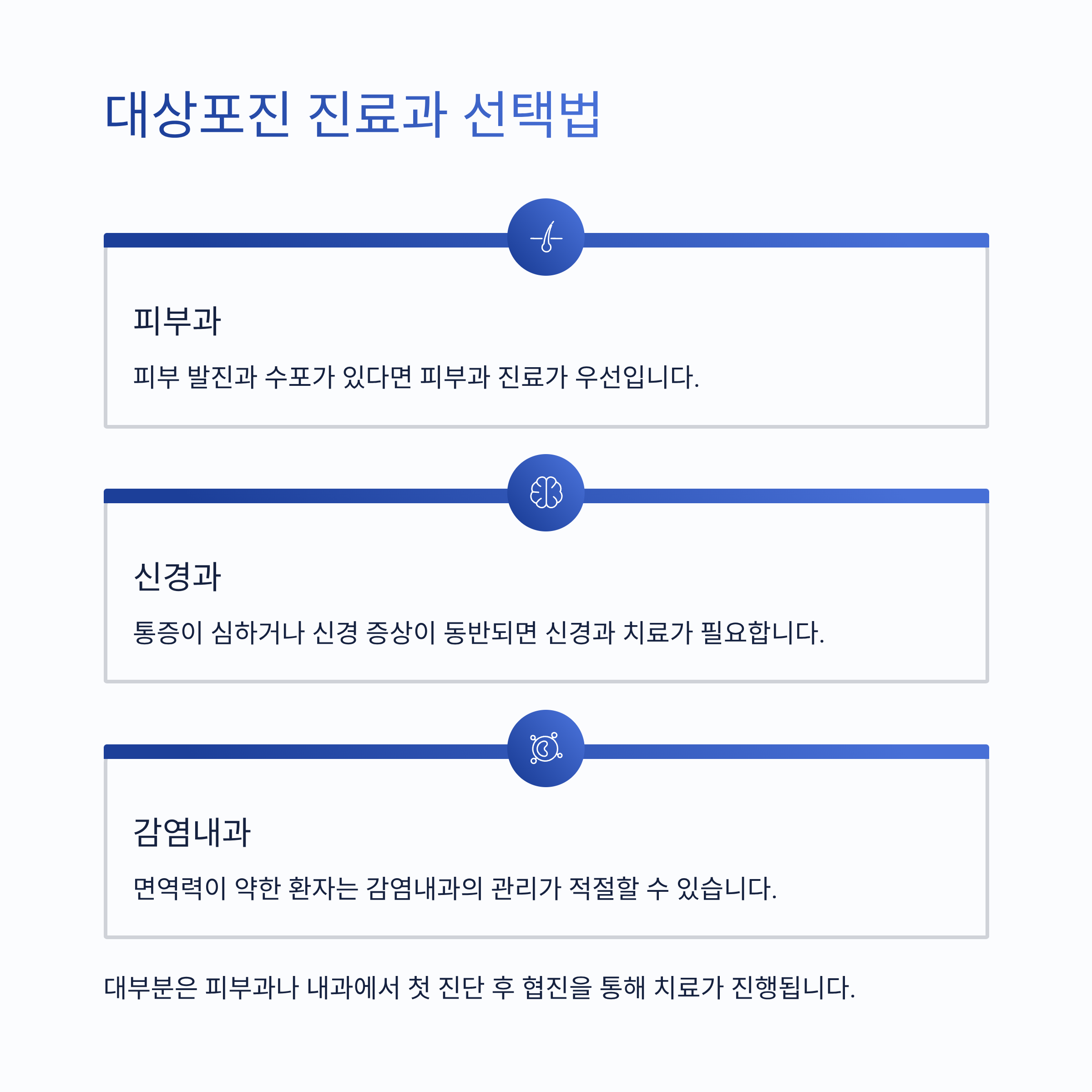 대부분은 피부과나 내과에서 첫 진단 후 협진을 통해 치료가 진행됩니다.