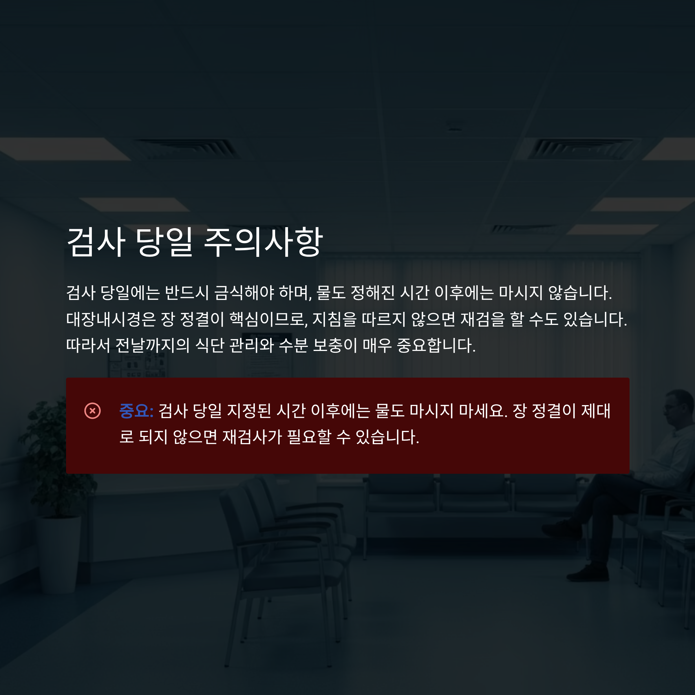 검사 당일에는 반드시 금식해야 하며, 물도 정해진 시간 이후에는 마시지 않습니다.