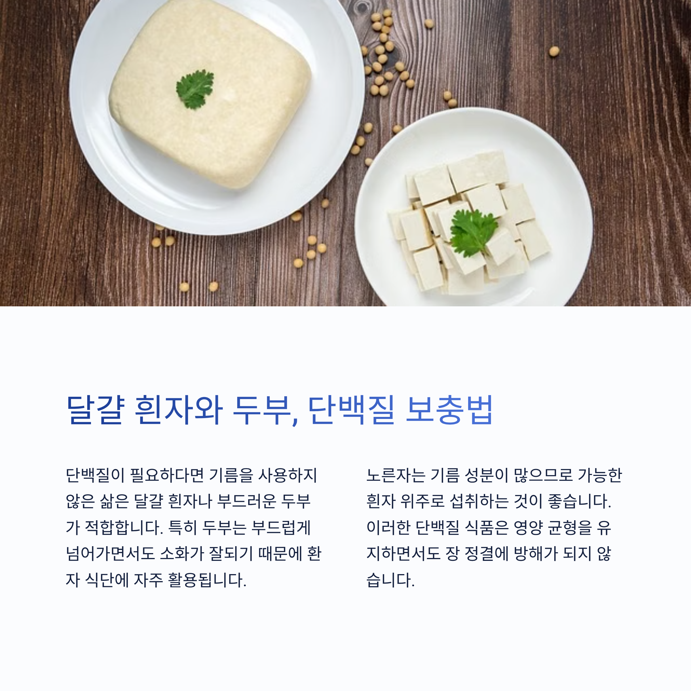 단백질이 필요하다면 기름을 사용하지 않은 삶은 달걀 흰자나 부드러운 두부가 적합합니다.