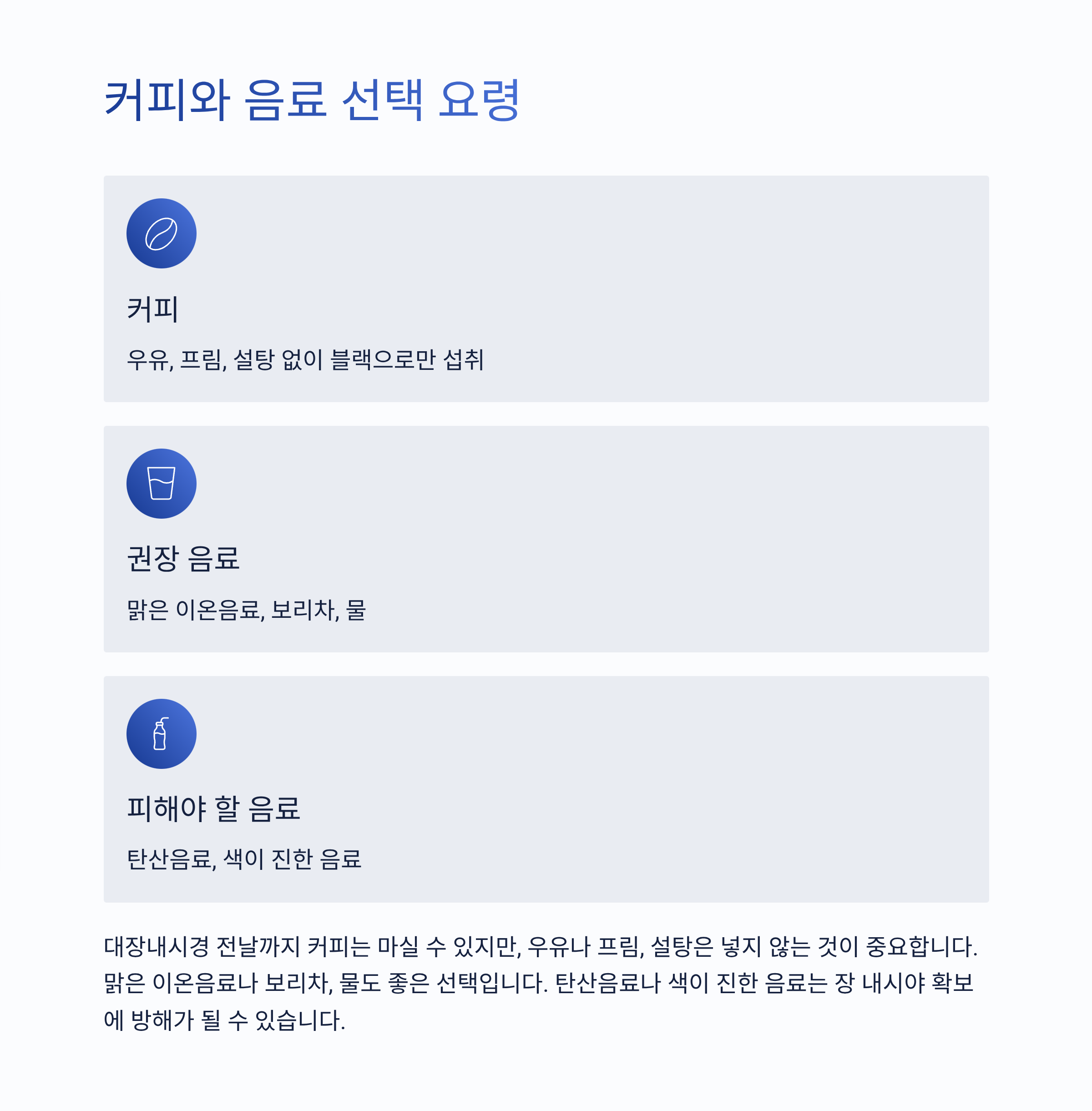 대장내시경은 장을 깨끗하게 비워야 정확한 검사가 가능합니다. 따라서 검사 3일 전부터 전날까지 먹는 음식에 주의가 필요합니다. 소화가 잘되고 장에 찌꺼기를 남기지 않는 음식이 권장되며, 반대로 섬유질이나 기름진 음식은 피하는 것이 좋습니다. 이 글에서는 커피, 카스테라 같은 가벼운 음식부터 단계별 식단까지 정리해드립니다.