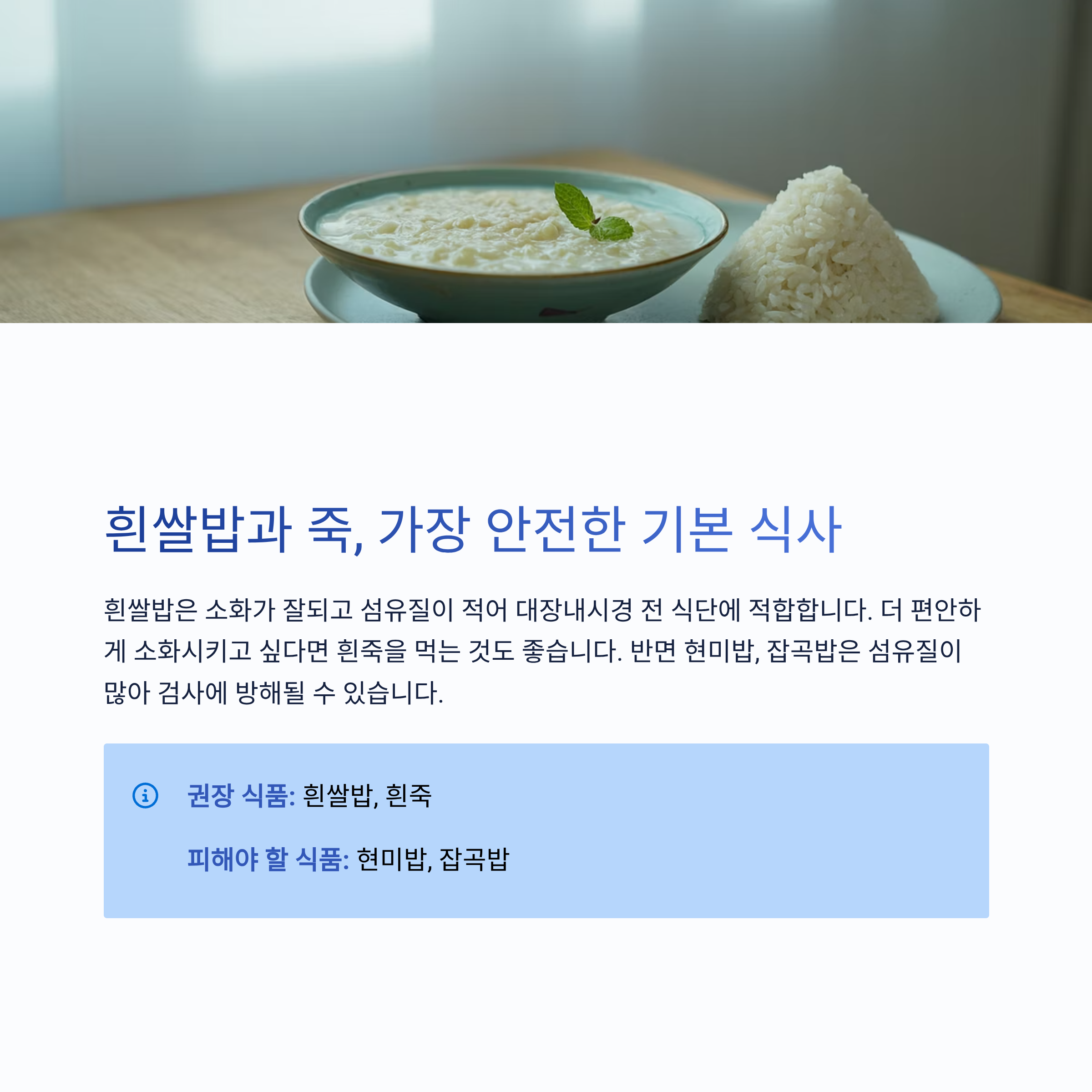 흰쌀밥은 소화가 잘되고 섬유질이 적어 대장내시경 전 식단에 적합합니다.