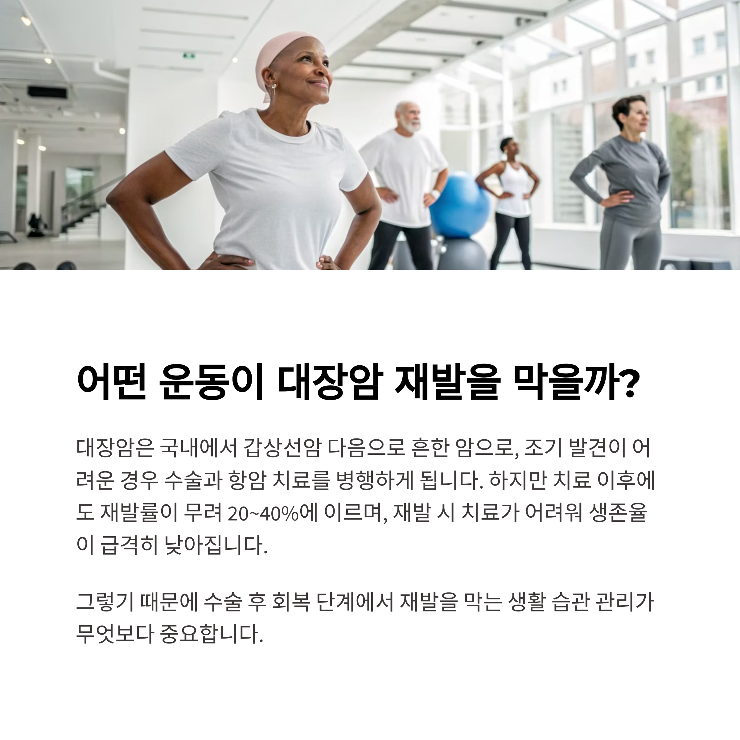 대장암 수술 후 규칙적인 운동이 얼마나 중요한지를 보여주는 연구가 세계 최고 의학 저널에 실렸습니다. 서울대병원 이은봉 교수는 뉴잉글랜드 의학 저널에 발표된 이 연구를 바탕으로, 대장암 수술 후 규칙적인 운동이 재발률과 사망률을 동시에 줄여준다는 놀라운 결과를 소개했습니다. 이 글에서는 해당 연구의 핵심 내용과 함께, 운동 강도별 구체적인 운동 예시를 통해 어떤 운동을 어떻게 실천해야 할지 알아보겠습니다.