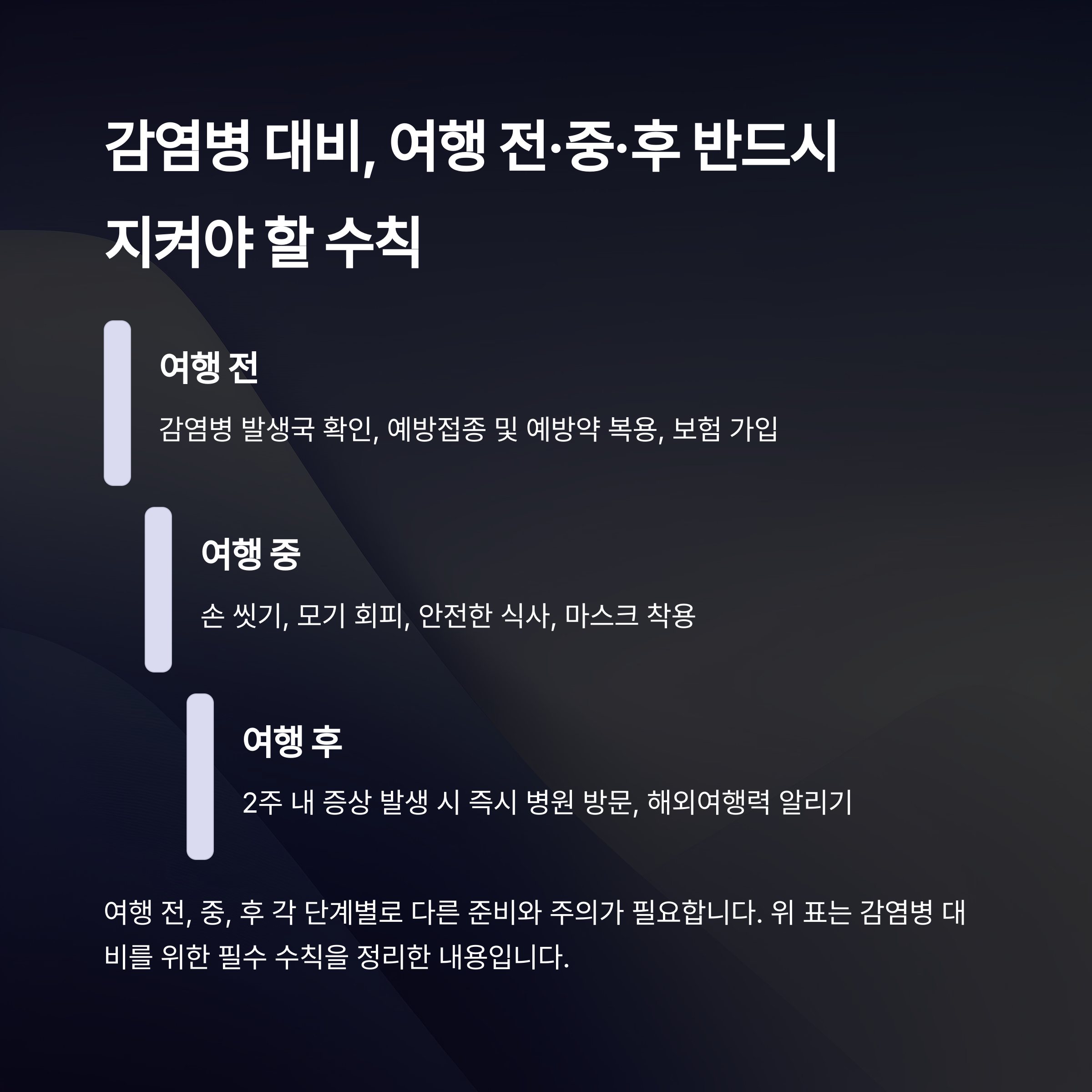 여행 전, 중, 후 각 단계별로 다른 준비와 주의가 필요합니다.