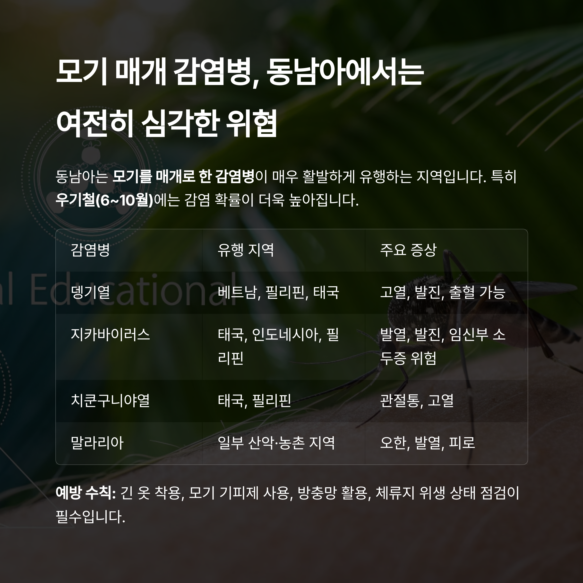 동남아는 모기를 매개로 한 감염병이 매우 활발하게 유행하는 지역입니다.