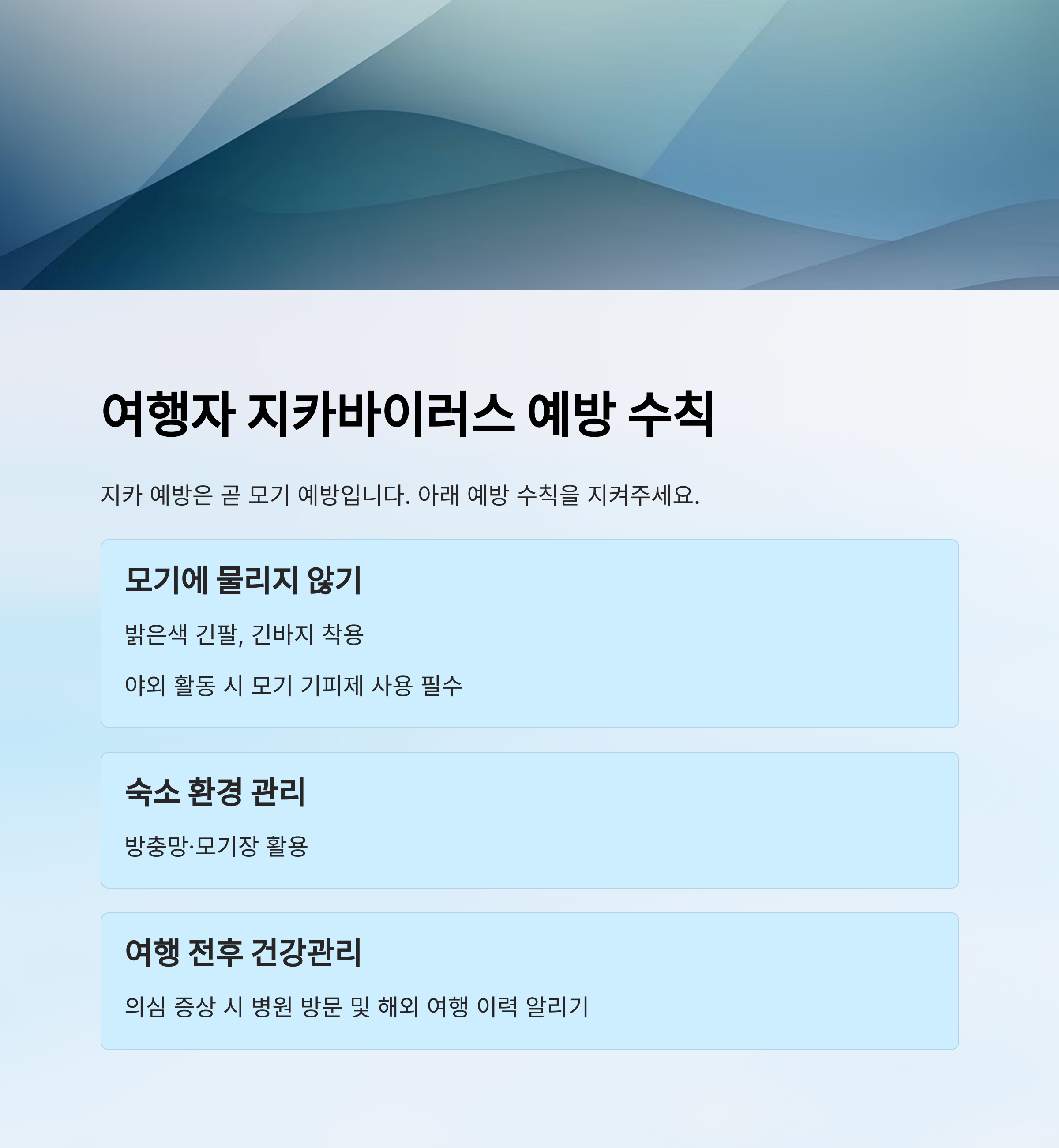 모기 회피 전략, 여행지 현황 확인, 귀국 후 증상 관찰 등
