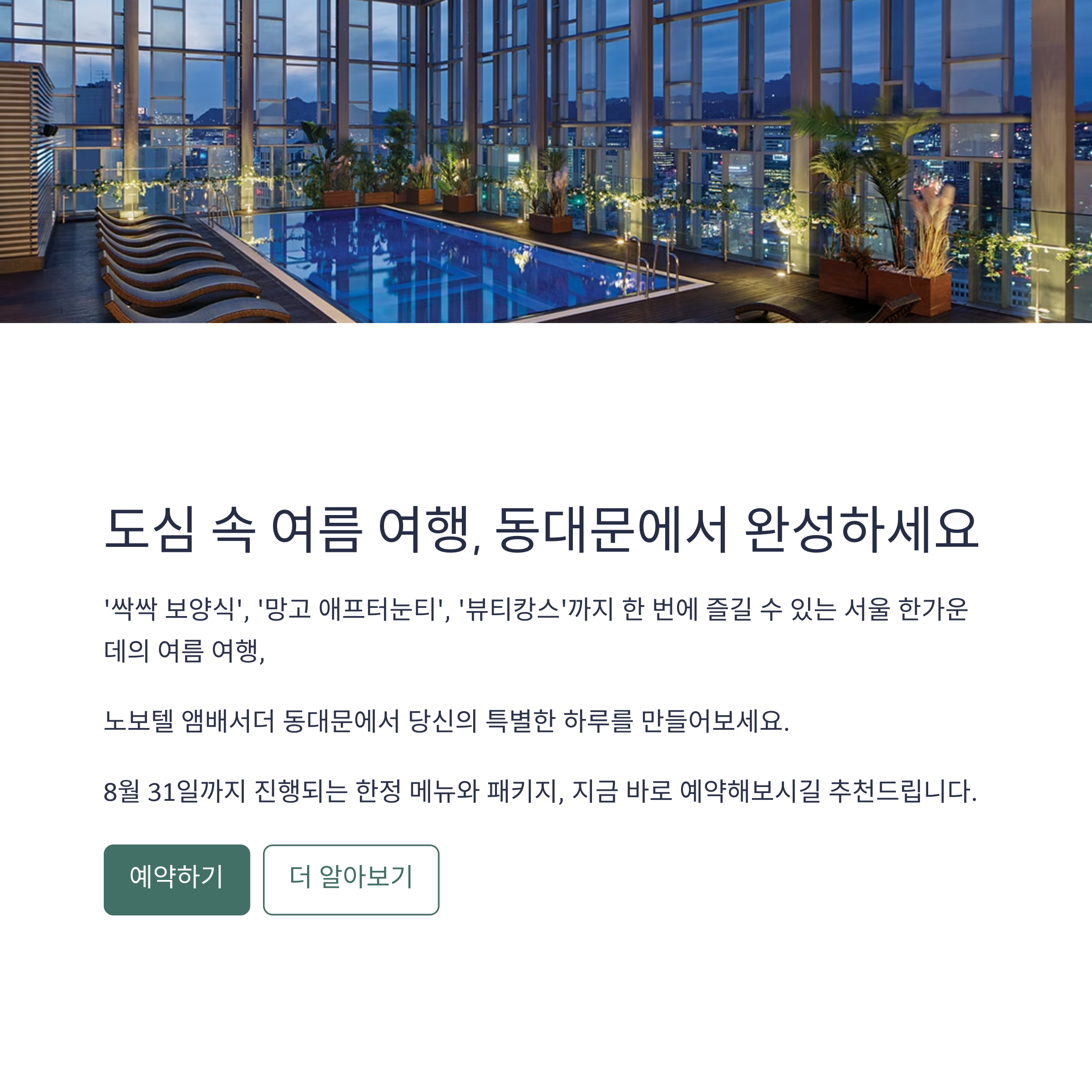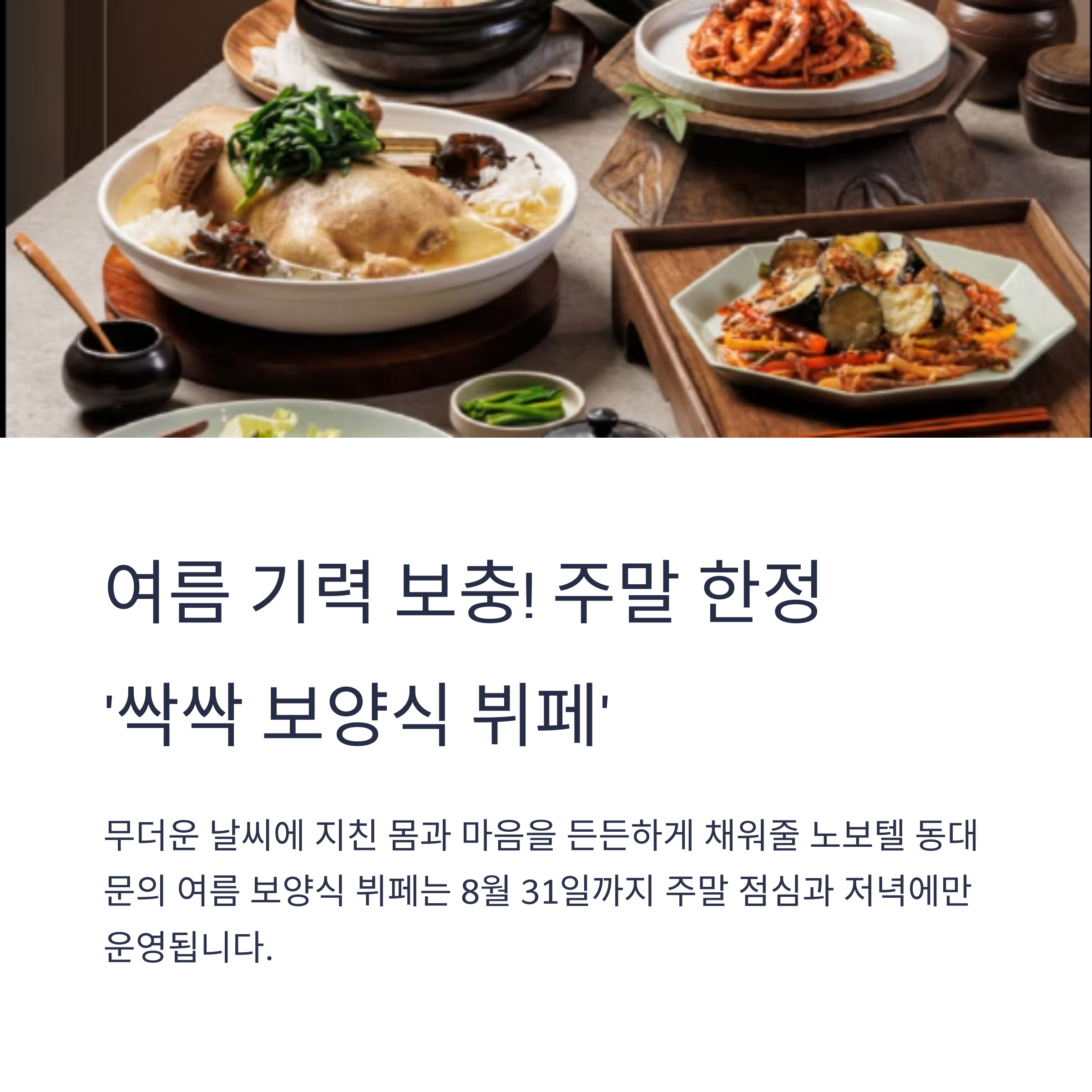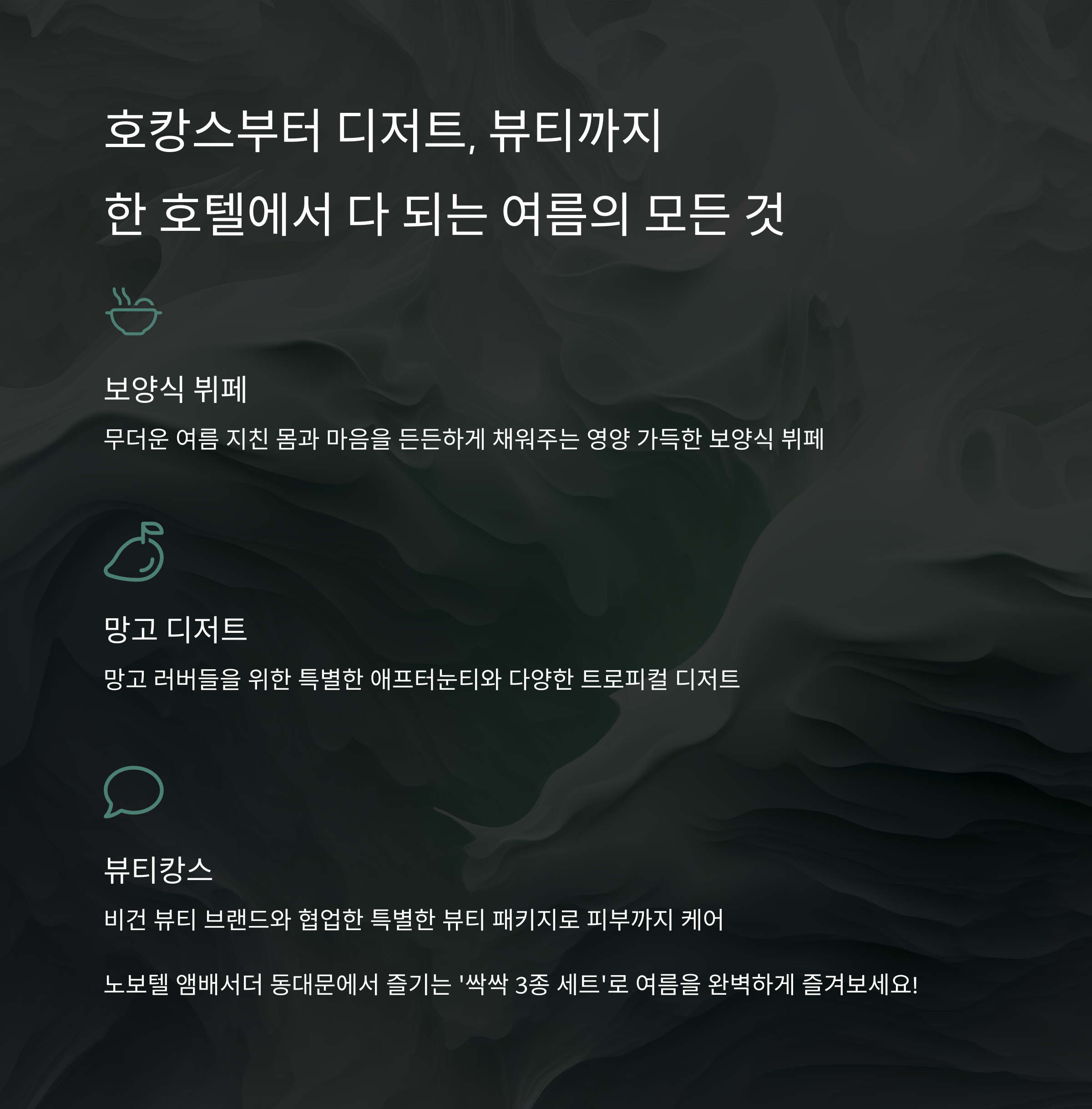 올여름 무더위 속에서 특별한 휴식을 찾고 있다면, 동대문에 위치한 노보텔 앰배서더 서울 동대문 호텔 & 레지던스를 주목해보세요. 보양식 뷔페부터 트로피컬 디저트, 뷰티 패키지까지 한 번에 즐길 수 있는 ‘싹싹 3종 세트’로 2030세대 사이에서 큰 인기를 끌고 있습니다. 지금부터 그 매력을 하나하나 정리해드립니다.