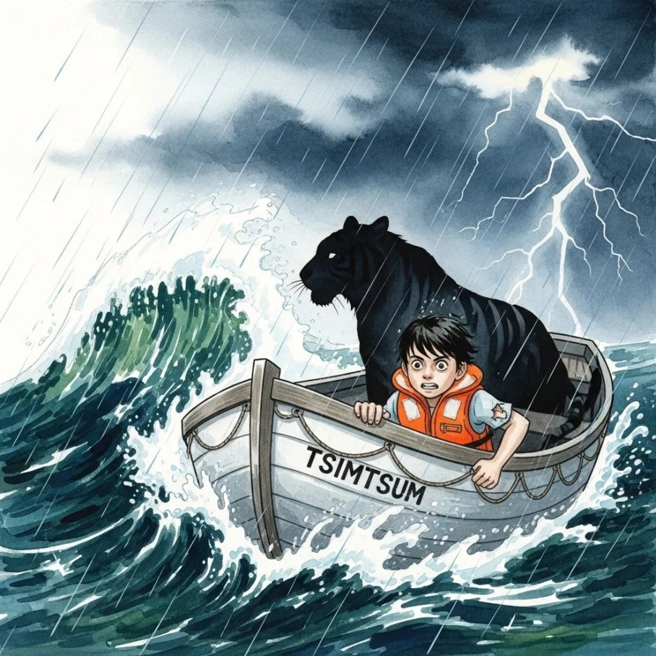 예상치 못한 거센 폭풍우에 배는 침몰하고, 파이는 가까스로 구명보트에 오르게 돼요.