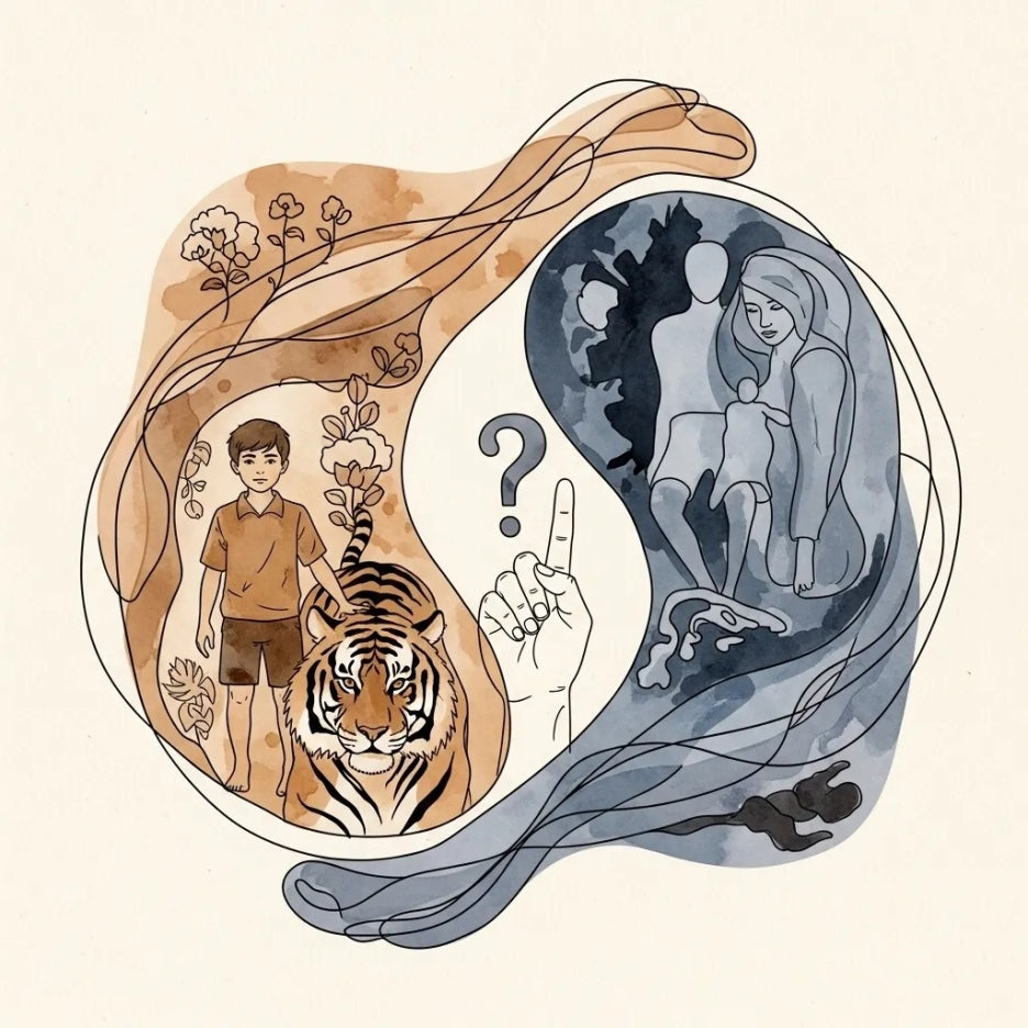 하나는 우리에게 익숙한 호랑이 리처드 파커와의 표류기이고, 다른 하나는 훨씬 더 잔혹하고 현실적인 인간들의 이야기죠.