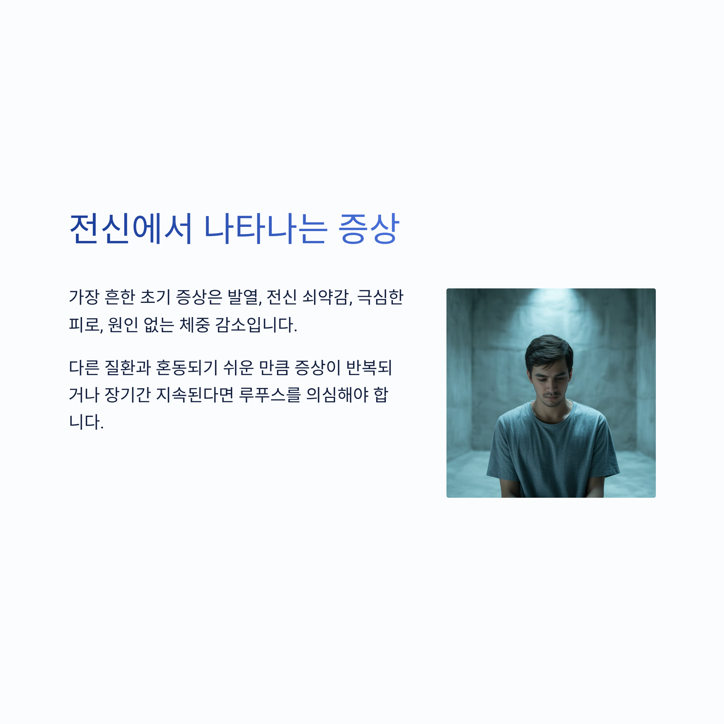 가장 흔한 초기 증상은 발열, 전신 쇠약감, 극심한 피로, 원인 없는 체중 감소입니다. 다른 질환과 혼동되기 쉬운 만큼 증상이 반복되거나 장기간 지속된다면 루푸스를 의심해야 합니다.