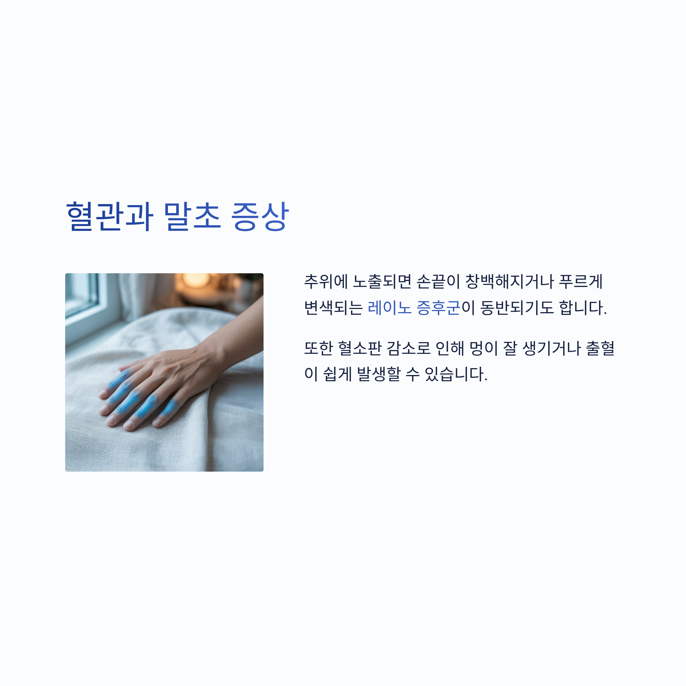 | 혈관·말초 | 레이노 증후군, 멍 잘 생김 |