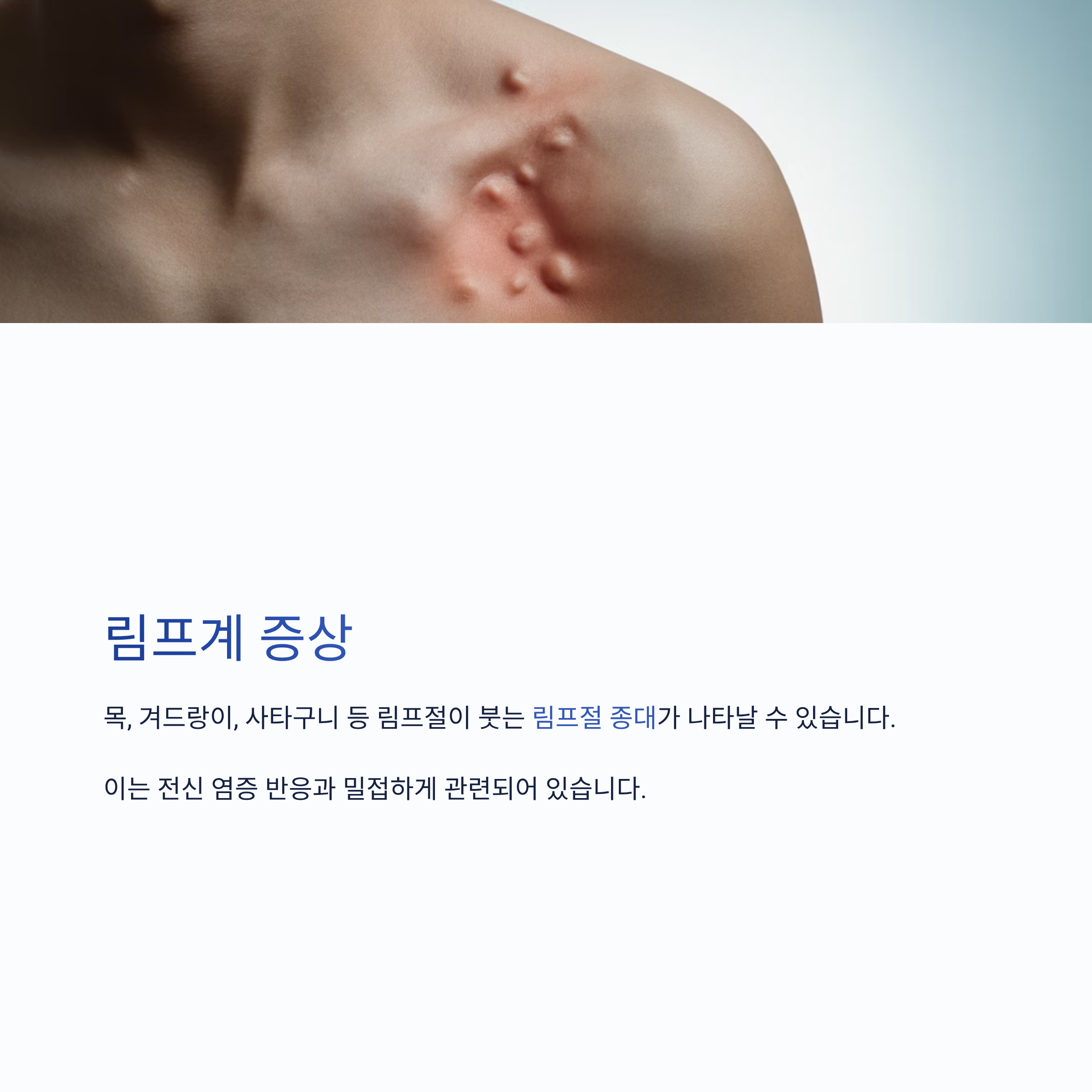 목, 겨드랑이, 사타구니 등 림프절이 붓는 림프절 종대가 나타날 수 있습니다. 이는 전신 염증 반응과 밀접하게 관련되어 있습니다.