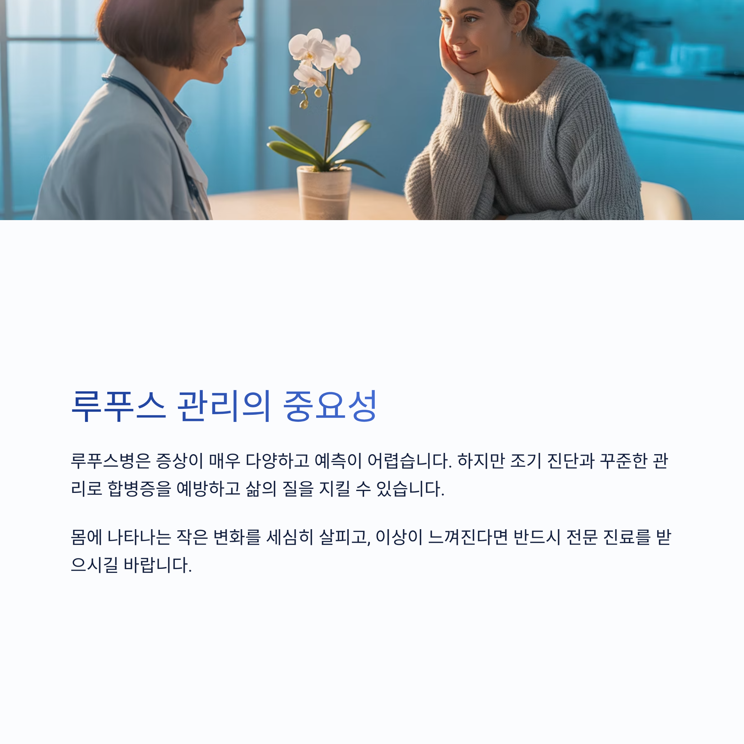 루푸스병은 증상이 매우 다양하고 예측이 어렵습니다. 하지만 조기 진단과 꾸준한 관리로 합병증을 예방하고 삶의 질을 지킬 수 있습니다. 몸에 나타나는 작은 변화를 세심히 살피고, 이상이 느껴진다면 반드시 전문 진료를 받으시길 바랍니다.
