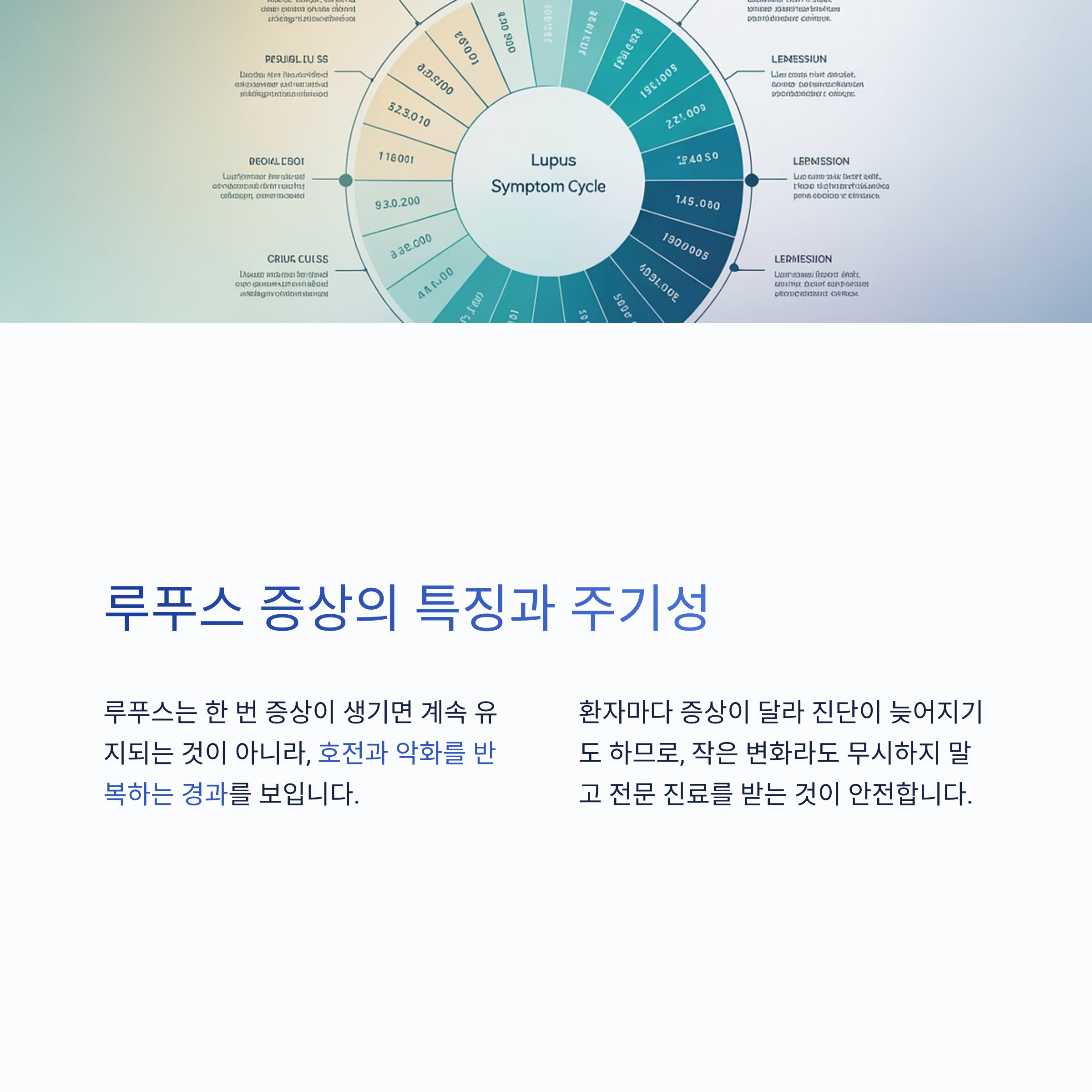 루푸스는 한 번 증상이 생기면 계속 유지되는 것이 아니라, 호전과 악화를 반복하는 경과를 보입니다. 환자마다 증상이 달라 진단이 늦어지기도 하므로, 작은 변화라도 무시하지 말고 전문 진료를 받는 것이 안전합니다.