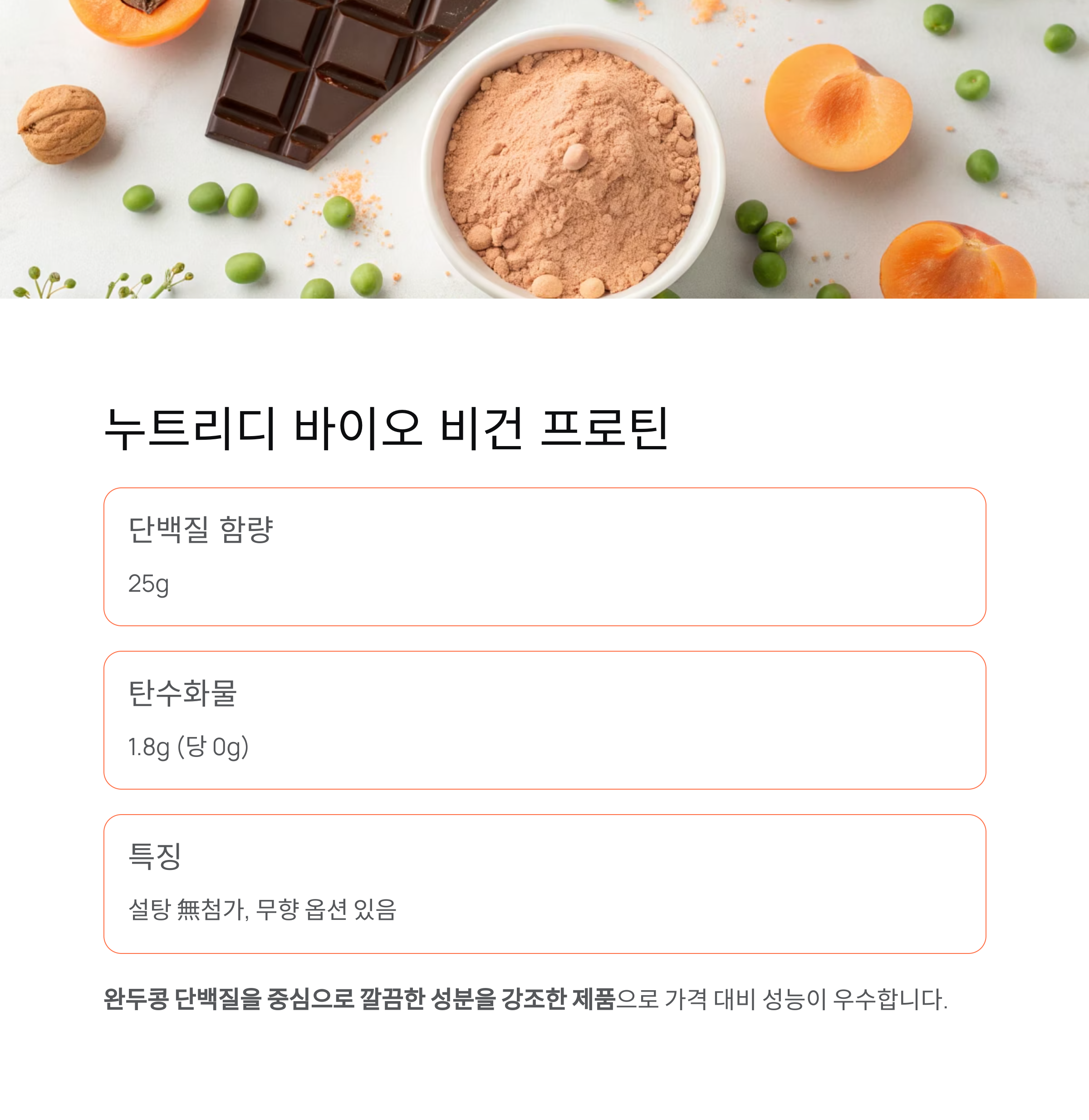 완두콩 단백질을 중심으로 깔끔한 성분을 강조한 제품입니다.