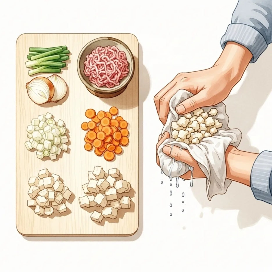 면보에 싸서 꾹 짜거나 키친타월로 물기를 흡수시켜 뽀송하게 준비해 주세요.