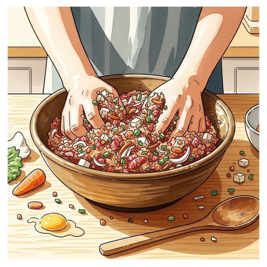 이제 준비된 재료들을 한데 모아 동그랑땡 반죽을 만들어 볼 시간이에요.