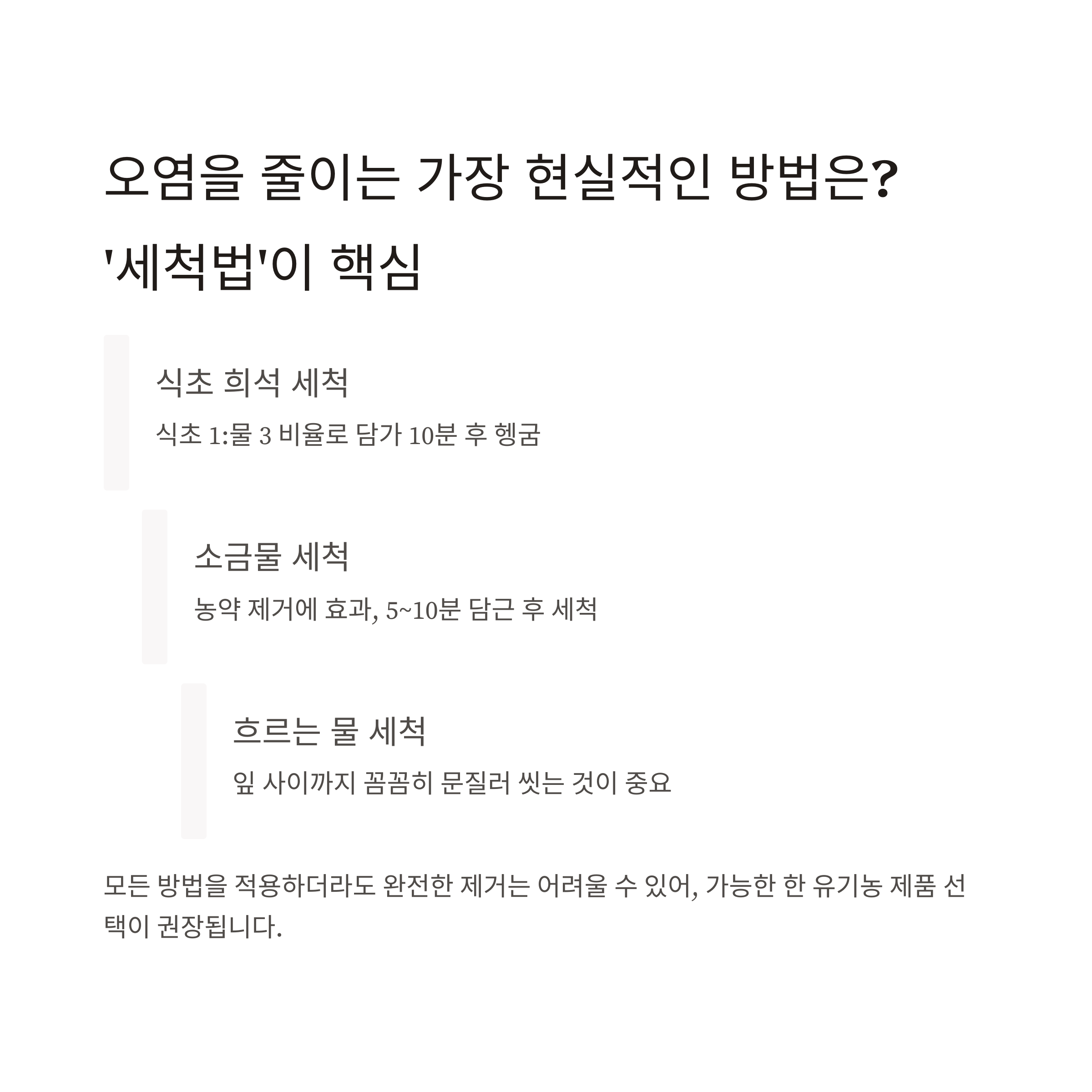 모든 방법을 적용하더라도 완전한 제거는 어려울 수 있어, 가능한 한 유기농 제품 선택이 권장됩니다.