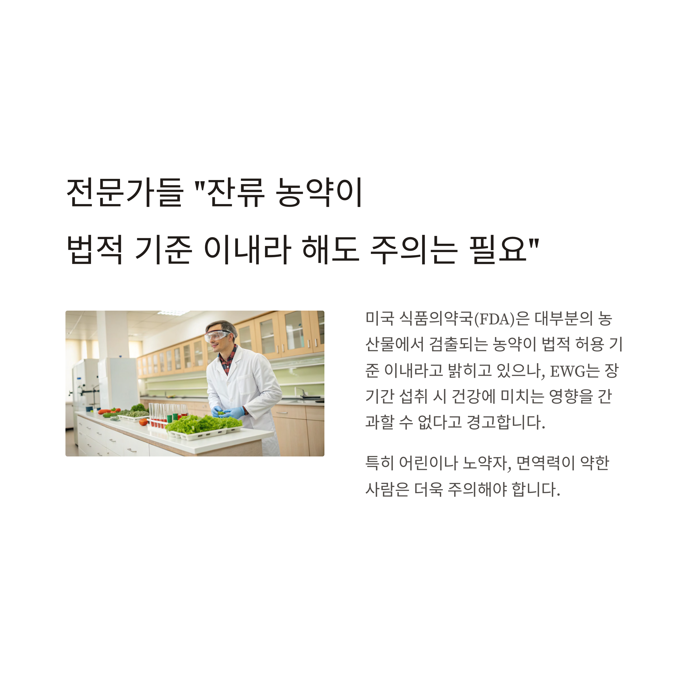 미국 식품의약국(FDA)은 대부분의 농산물에서 검출되는 농약이 법적 허용 기준 이내라고 밝히고 있으나,