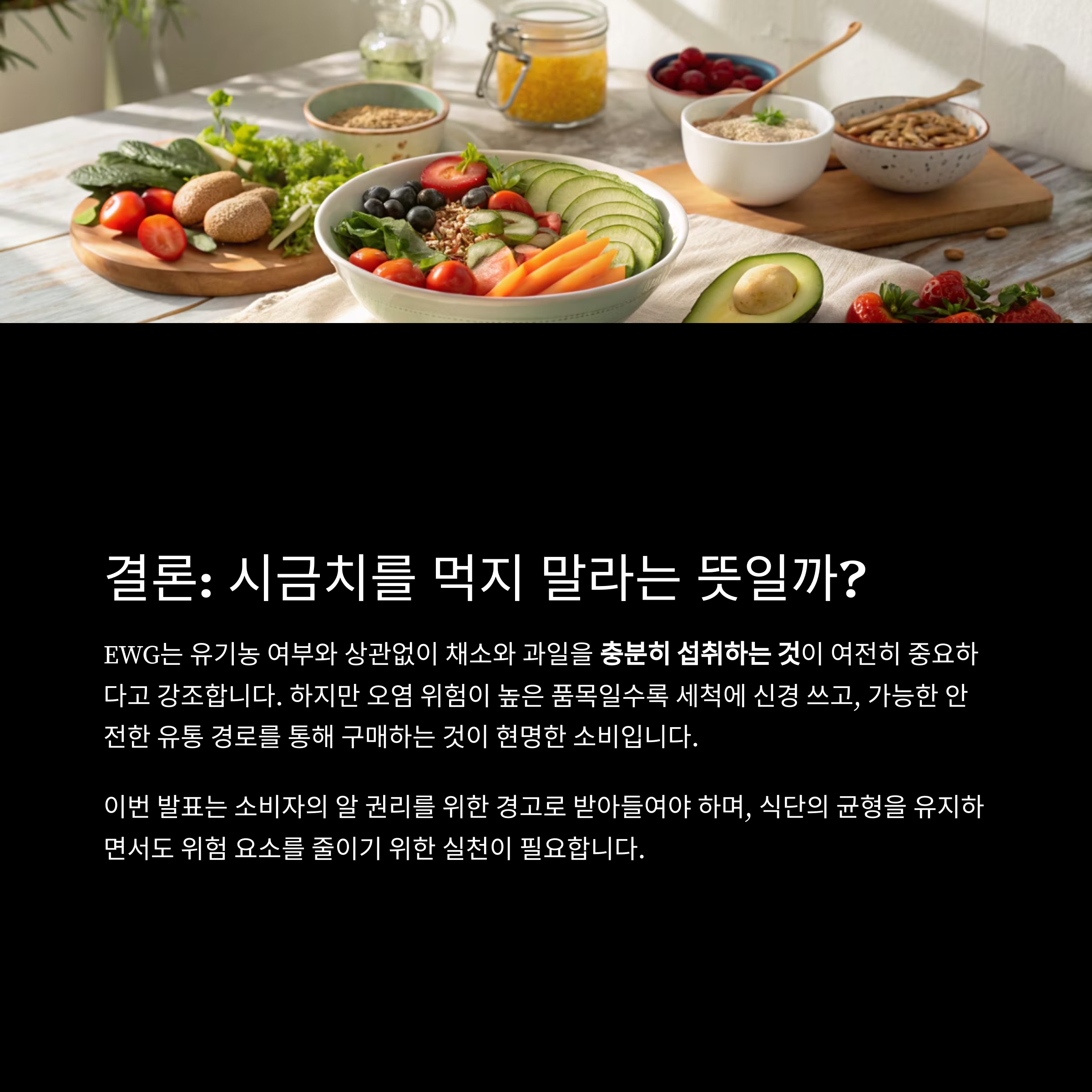 EWG는 유기농 여부와 상관없이 채소와 과일을 충분히 섭취하는 것이 여전히 중요하다고 강조합니다.