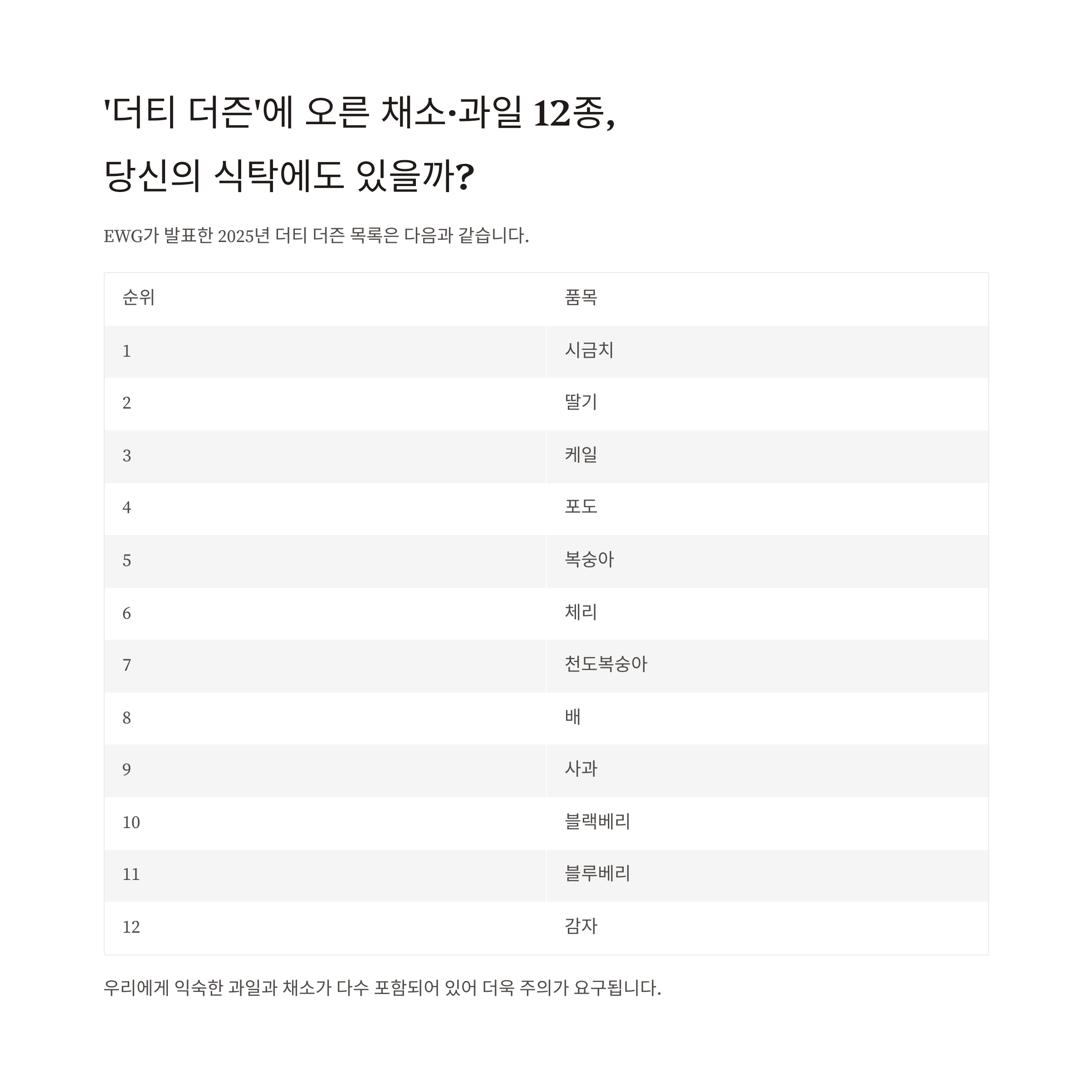 EWG가 발표한 2025년 더티 더즌 목록은 다음과 같습니다.
