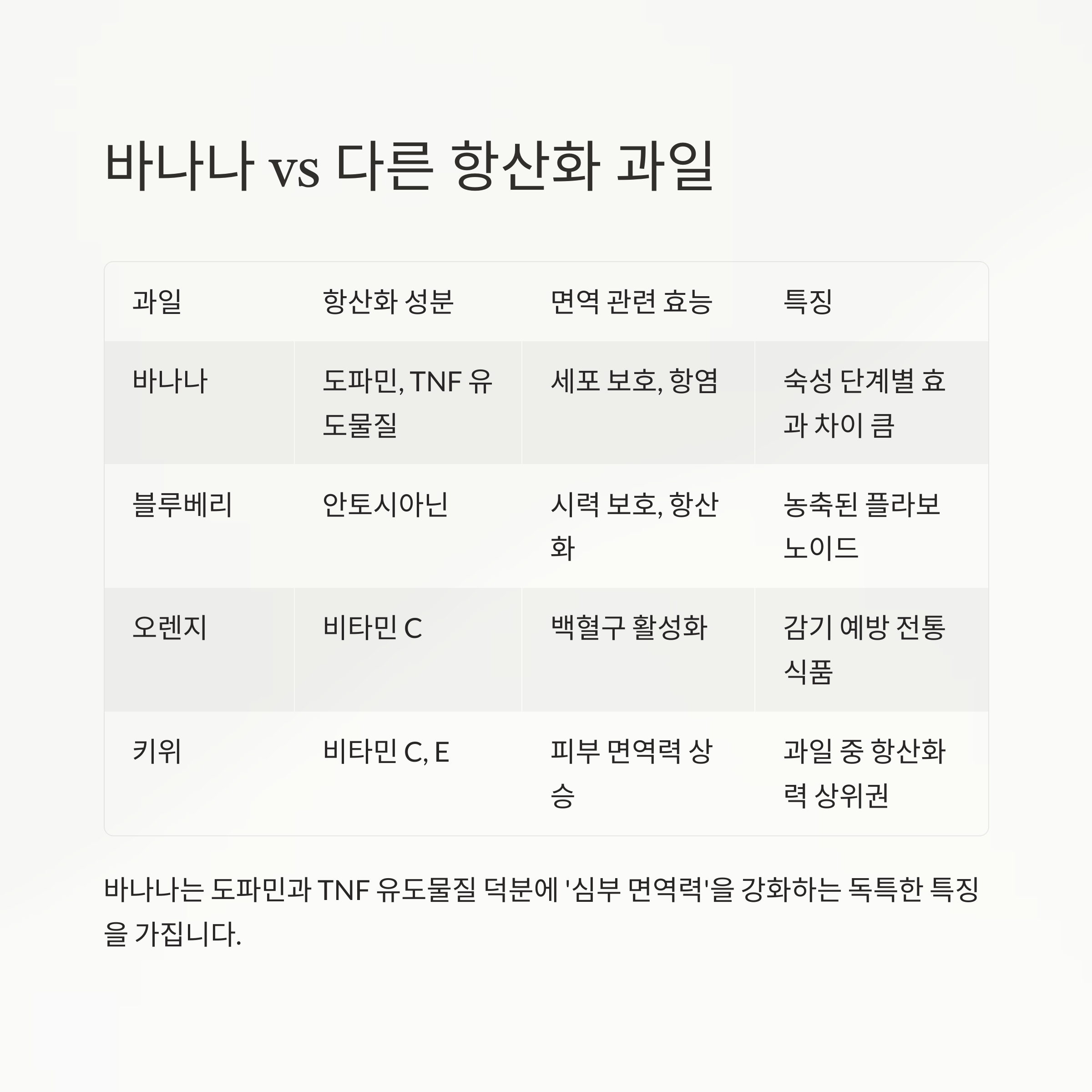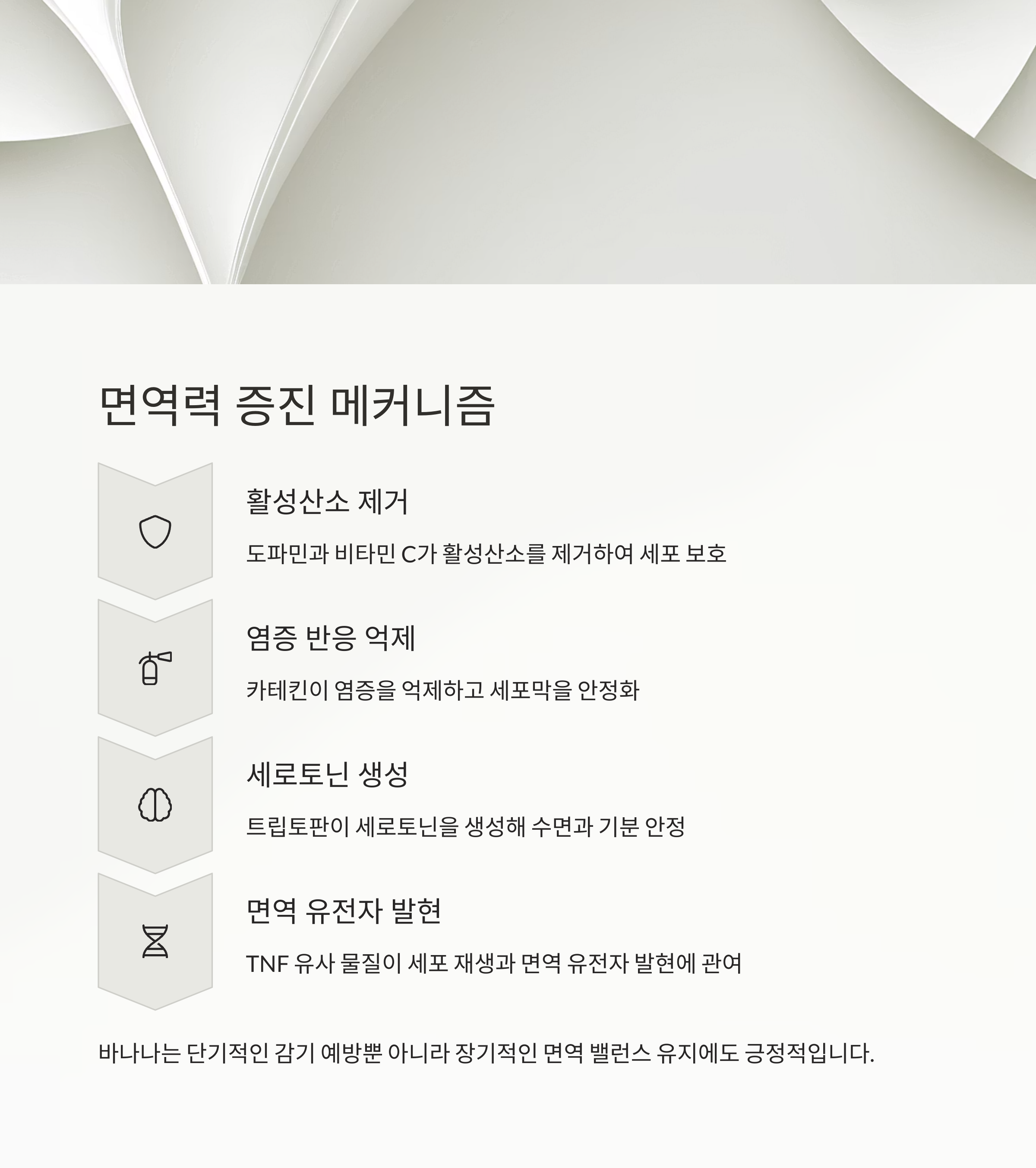 핵심: 바나나는 도파민과 TNF 유도물질 덕분에 ‘심부 면역력’을 강화하는 독특한 특징을 가집니다.