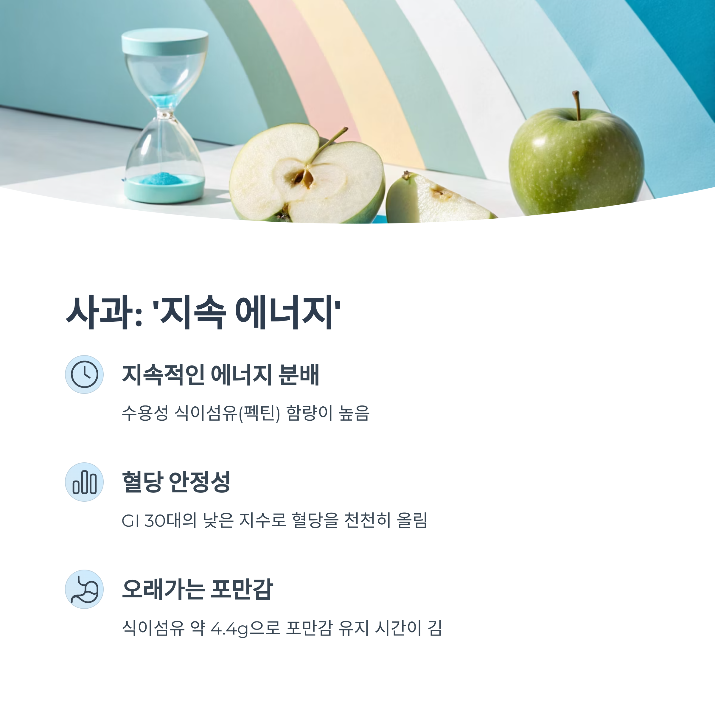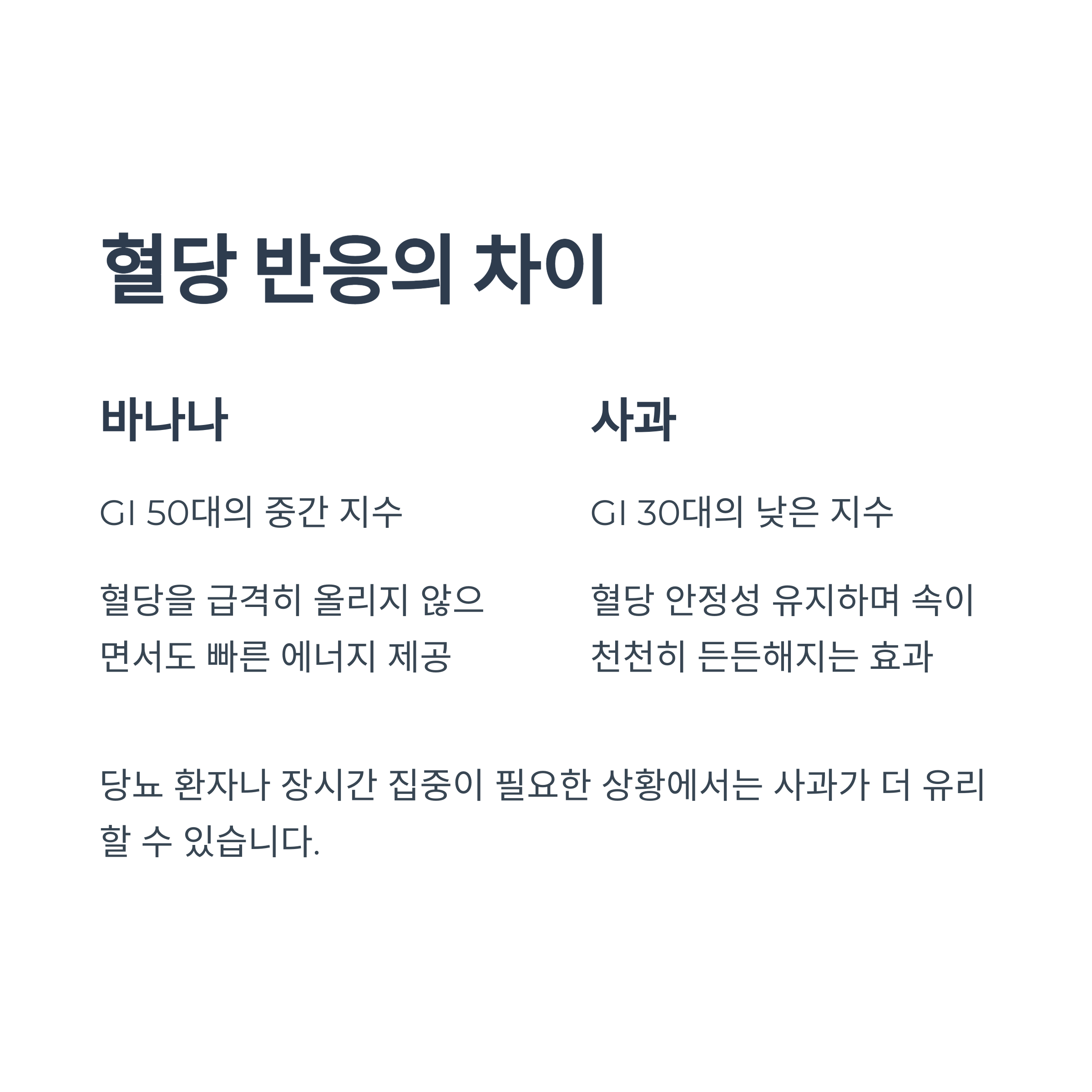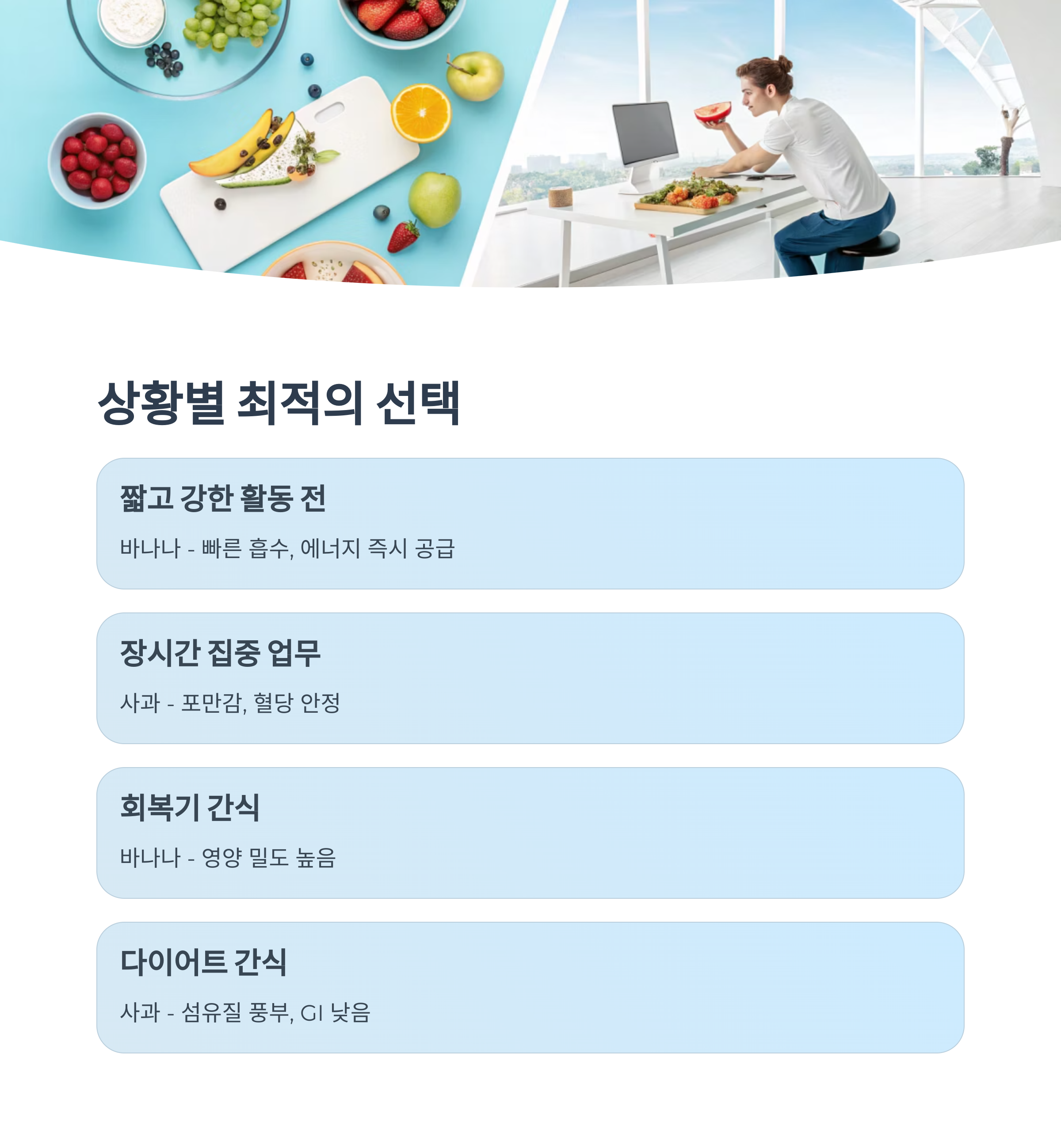 당뇨 환자나 장시간 집중이 필요한 상황에서는 사과가 더 유리할 수 있습니다.