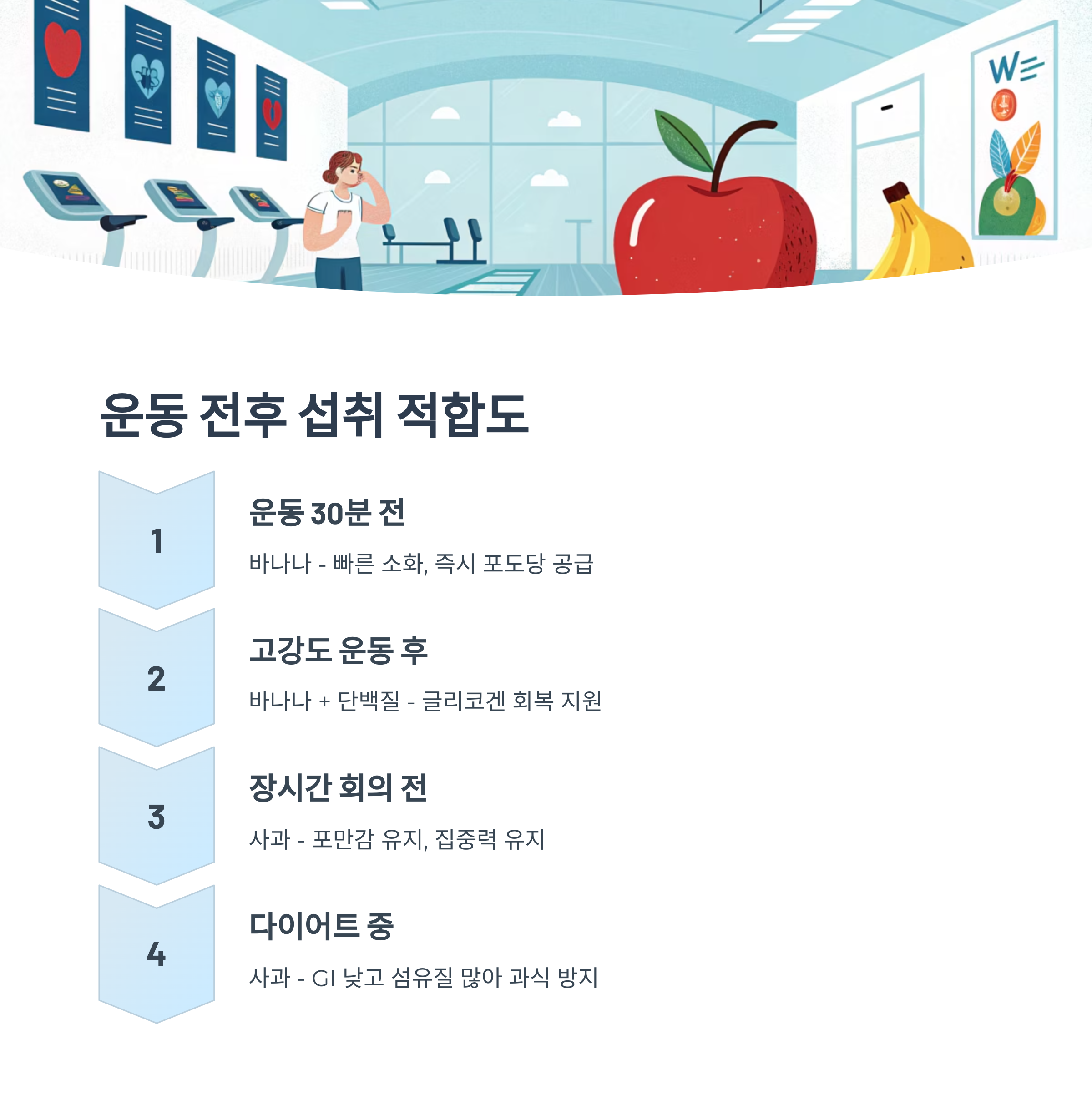 핵심: 바나나는 빠른 에너지 공급에, 사과는 지속적인 포만감에 유리합니다.