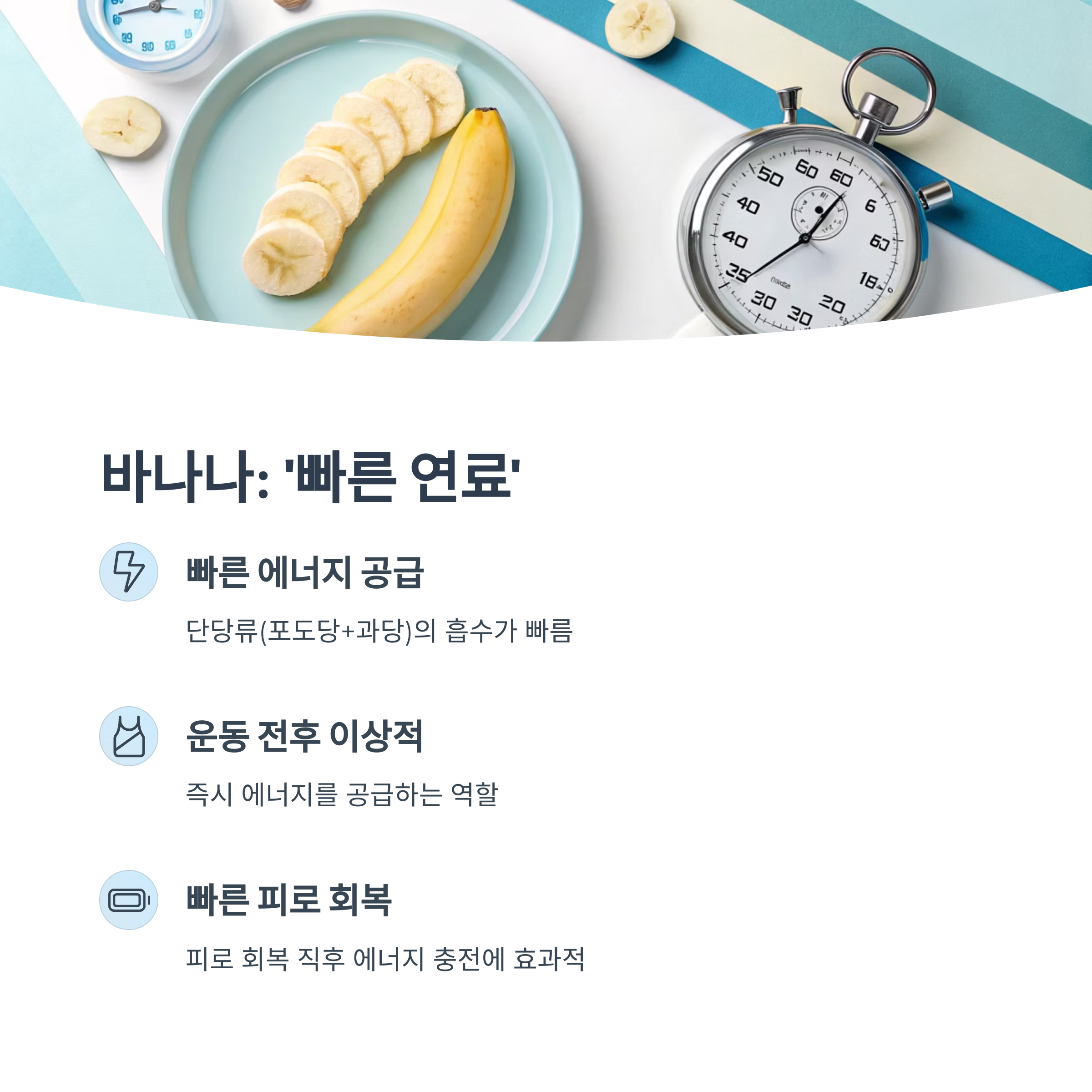 | 짧고 강한 활동 전 | 바나나 | 빠른 흡수, 에너지 즉시 공급 |