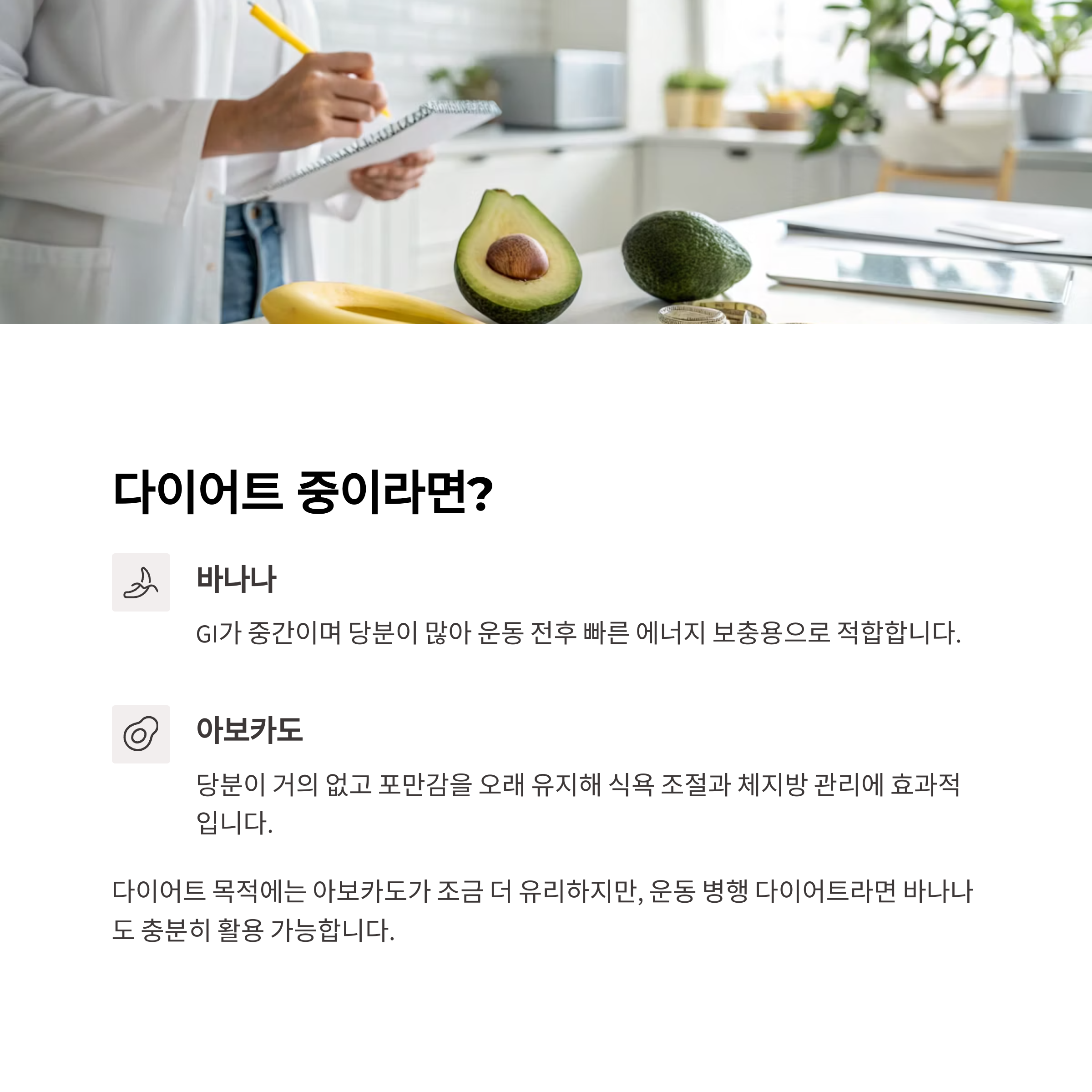 핵심: 바나나는 에너지·포도당 공급에, 아보카도는 심혈관·지방 균형에 탁월합니다.
