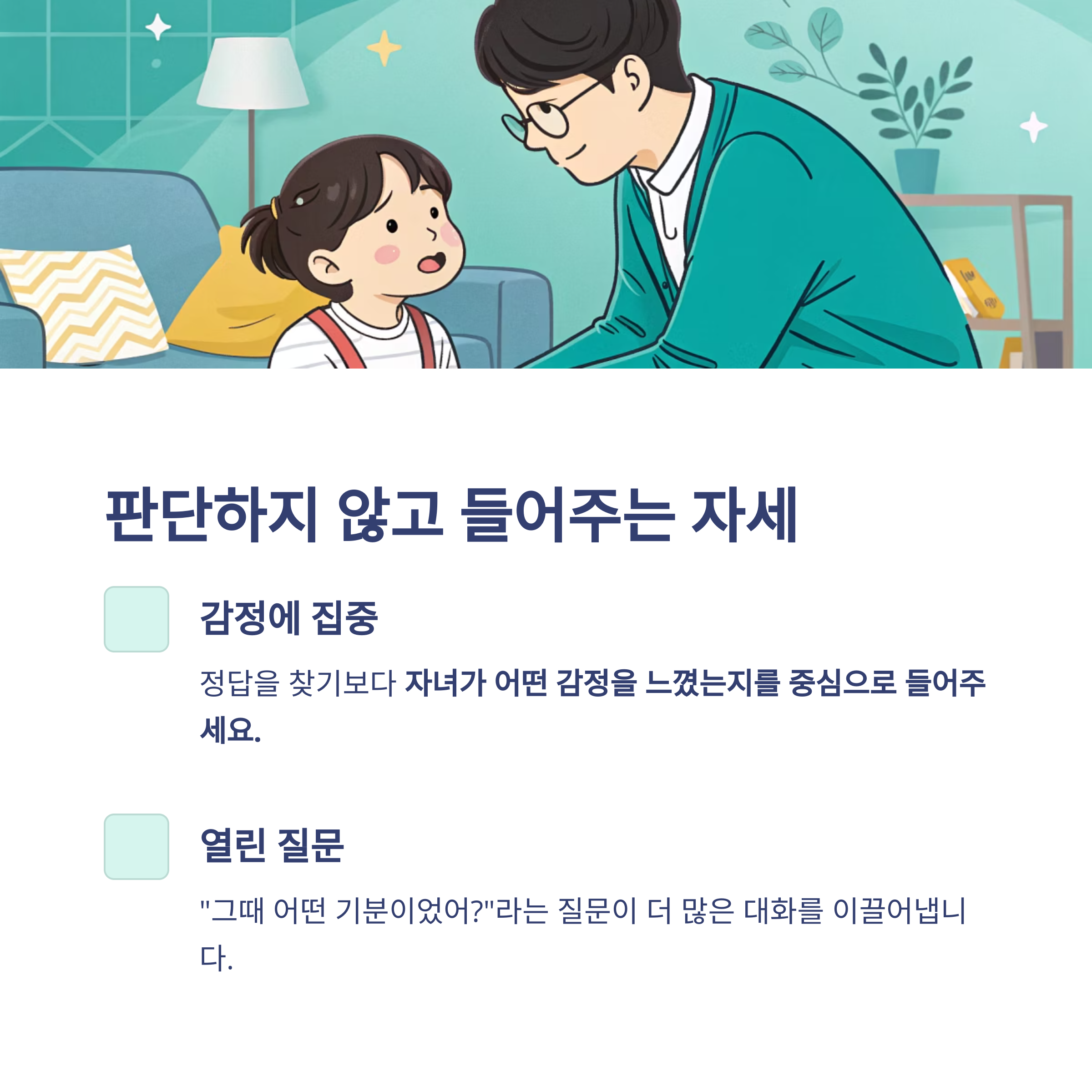정답을 찾기보다 그 상황에서 자녀가 어떤 감정을 느꼈는지를 중심으로 들어주세요