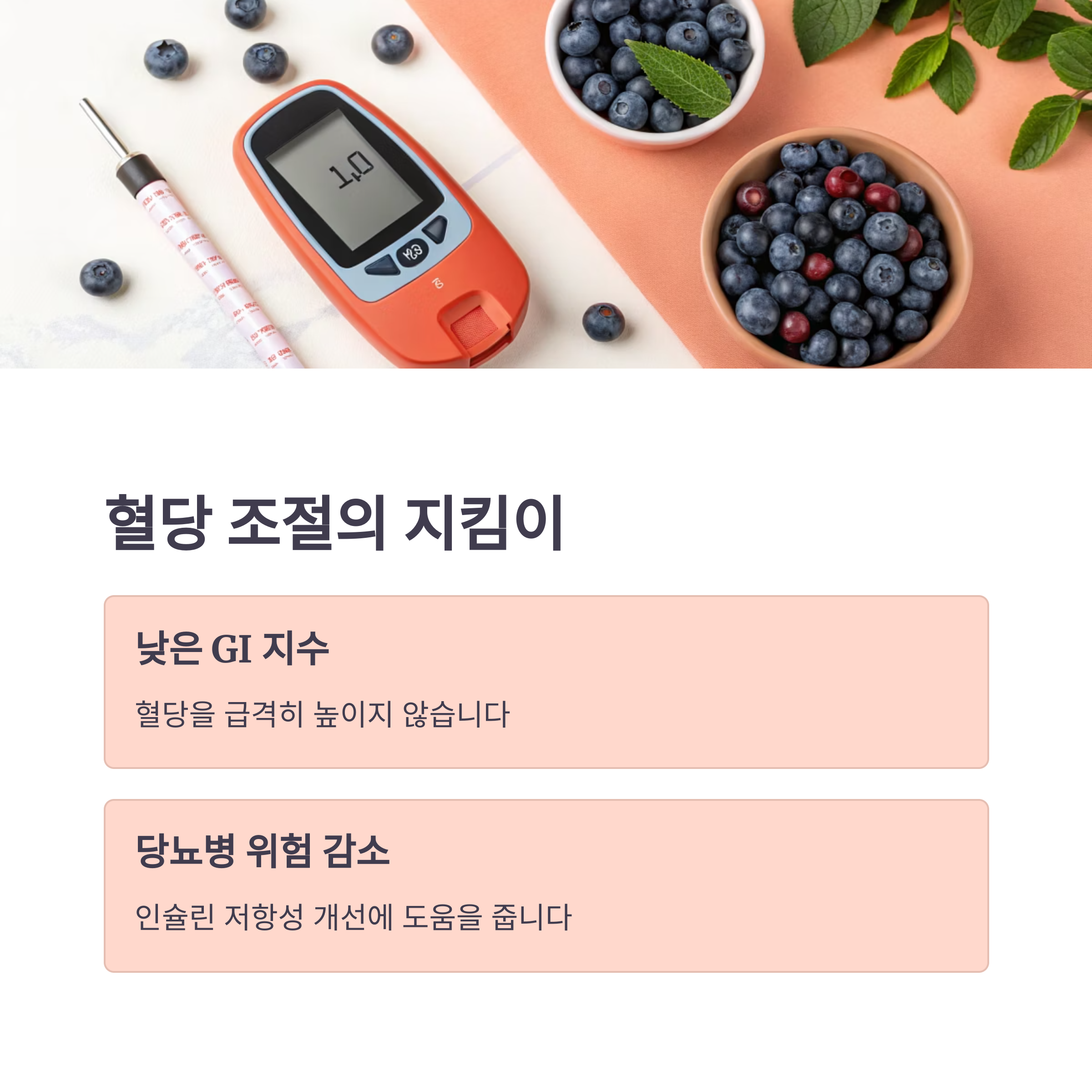 블루베리는 GI 지수가 낮아 혈당을 급격히 높이지 않으며,