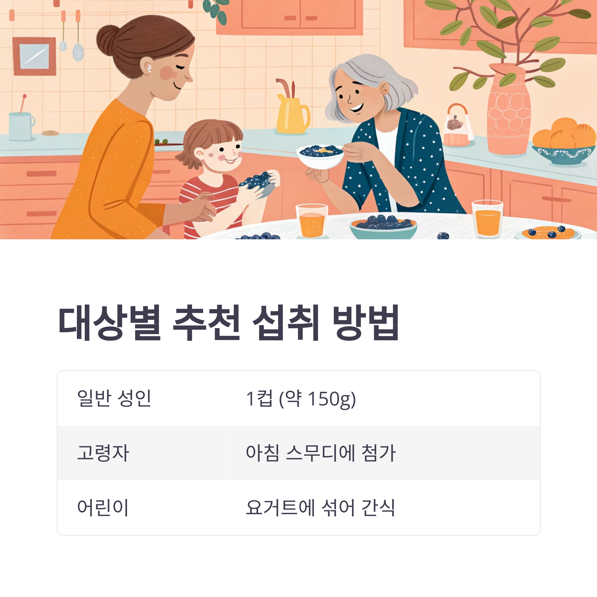 | 일반 성인 | 1컵 (약 150g) | 공복에 과다 섭취 금지 |