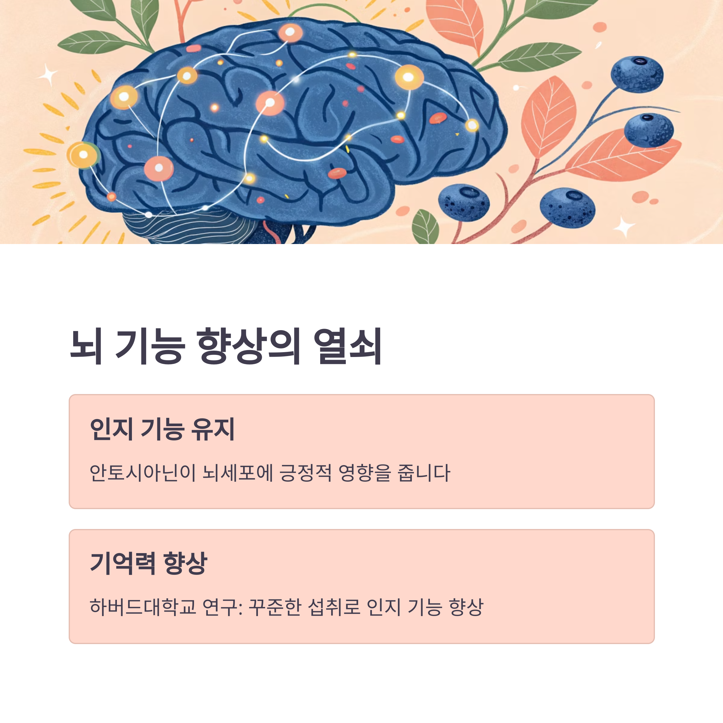 안토시아닌은 뇌세포에 긍정적인 영향을 주며, 집중력 및 기억력 향상에 기여합니다.