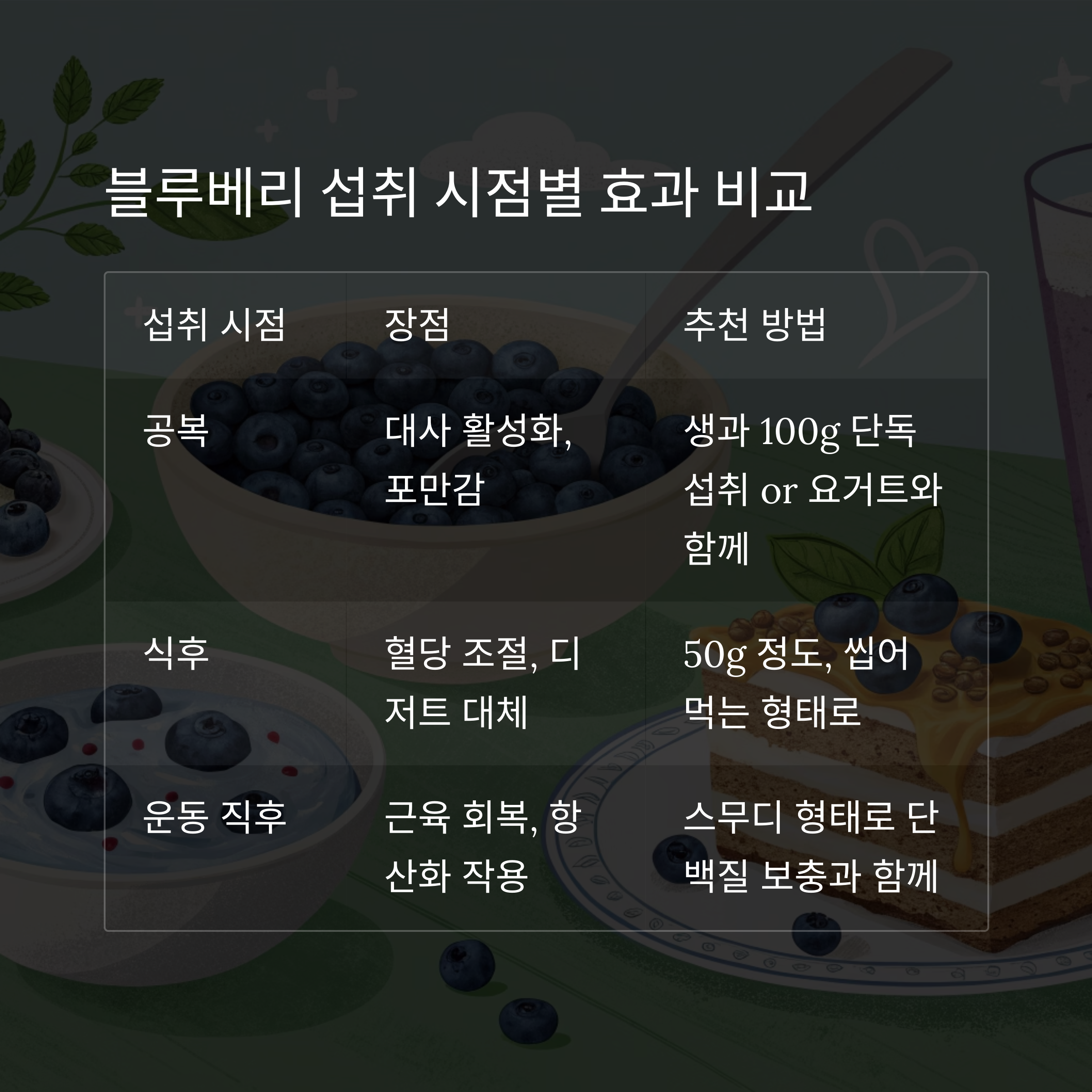 | 운동 직후 | 근육 회복, 항산화 작용 | 스무디 형태로 단백질 보충과 함께 |