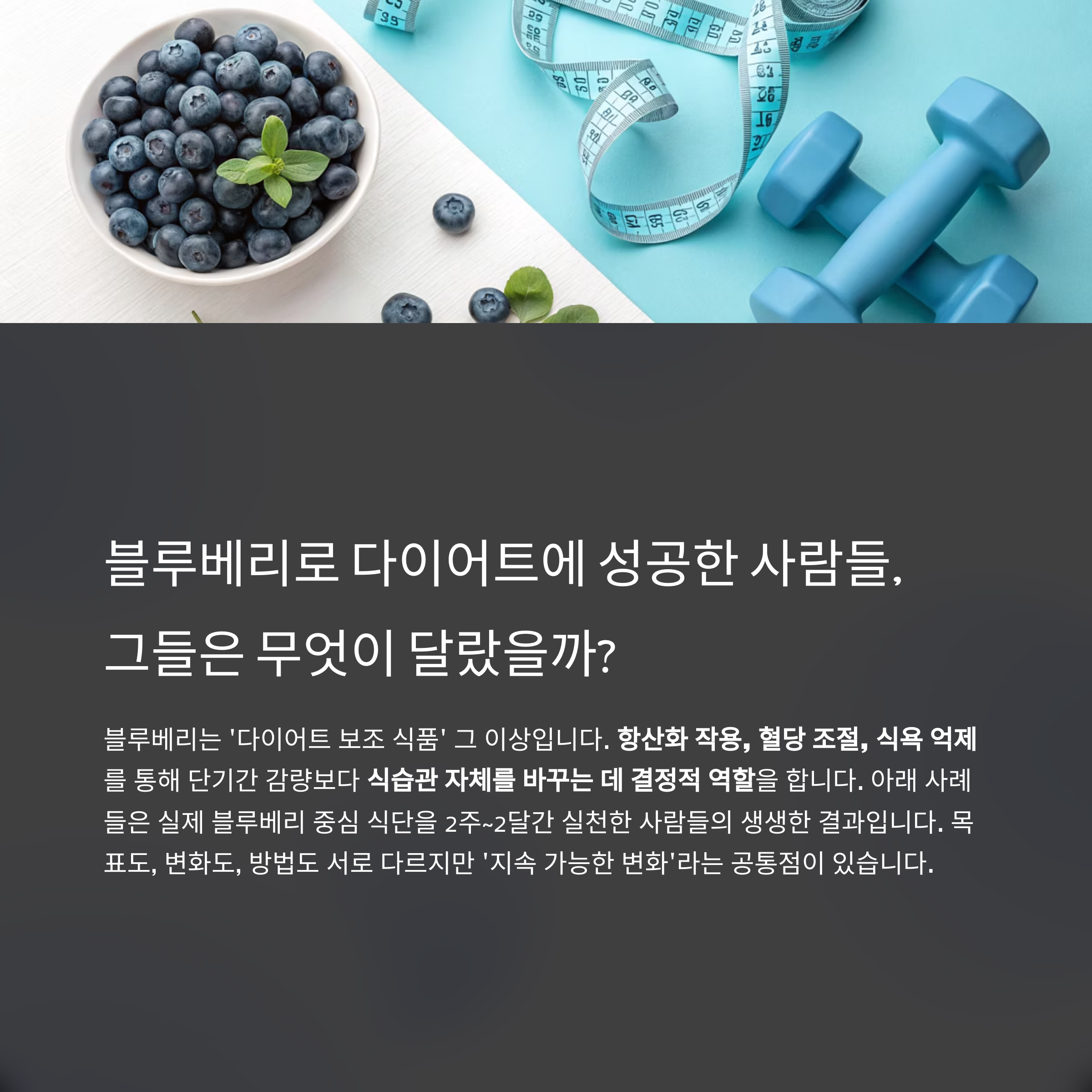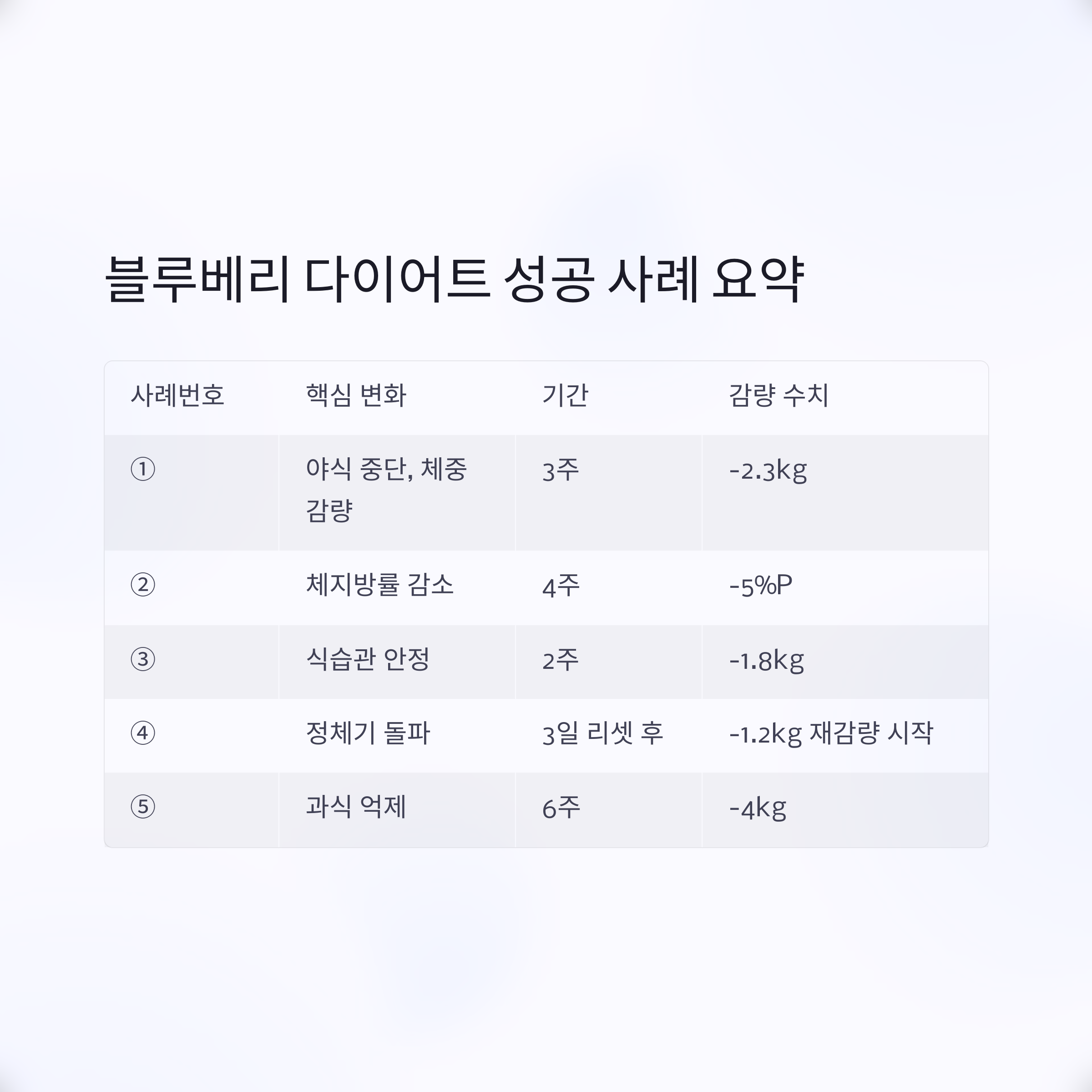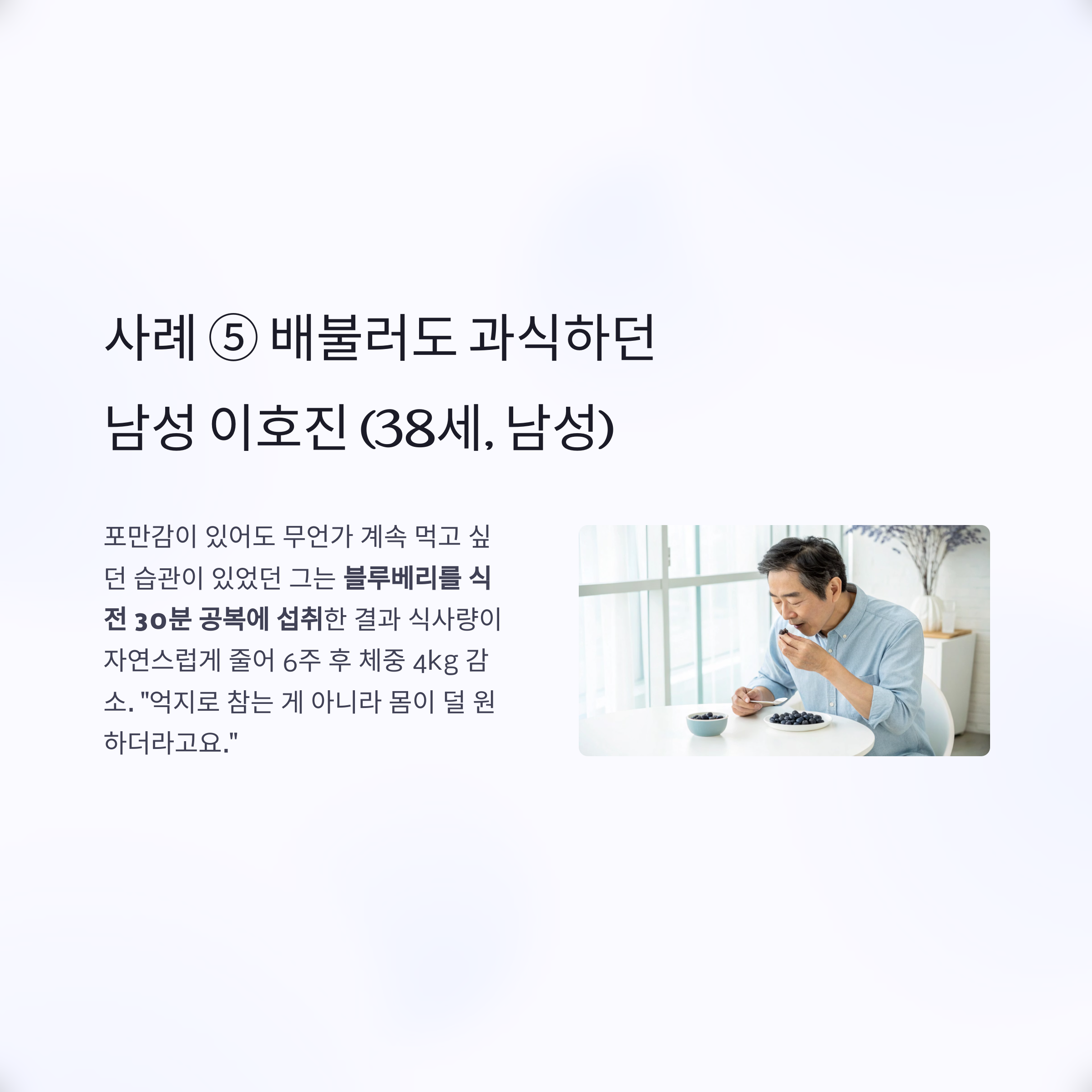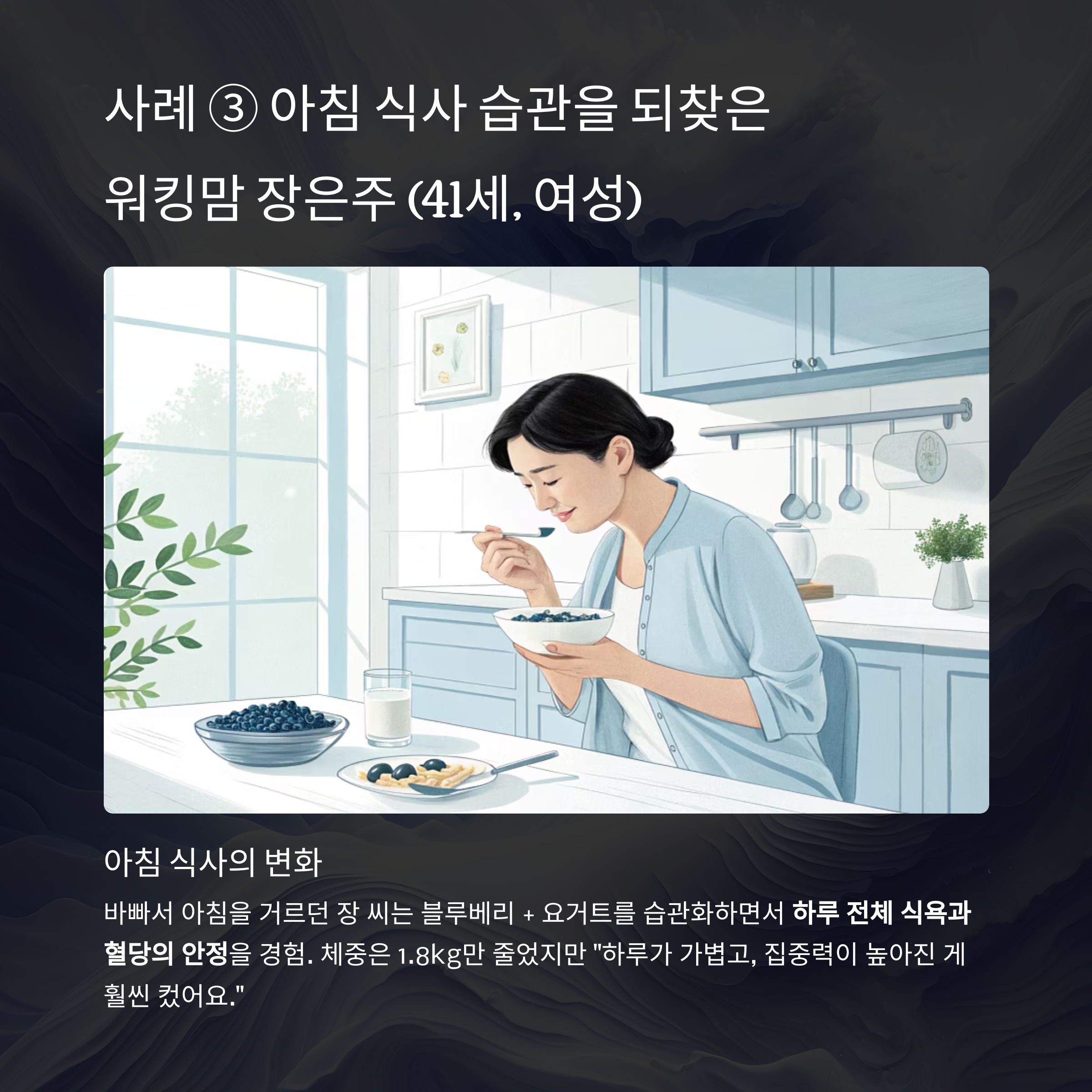 아래 사례들은 실제 블루베리 중심 식단을 2주~2달간 실천한 사람들의 생생한 결과입니다.