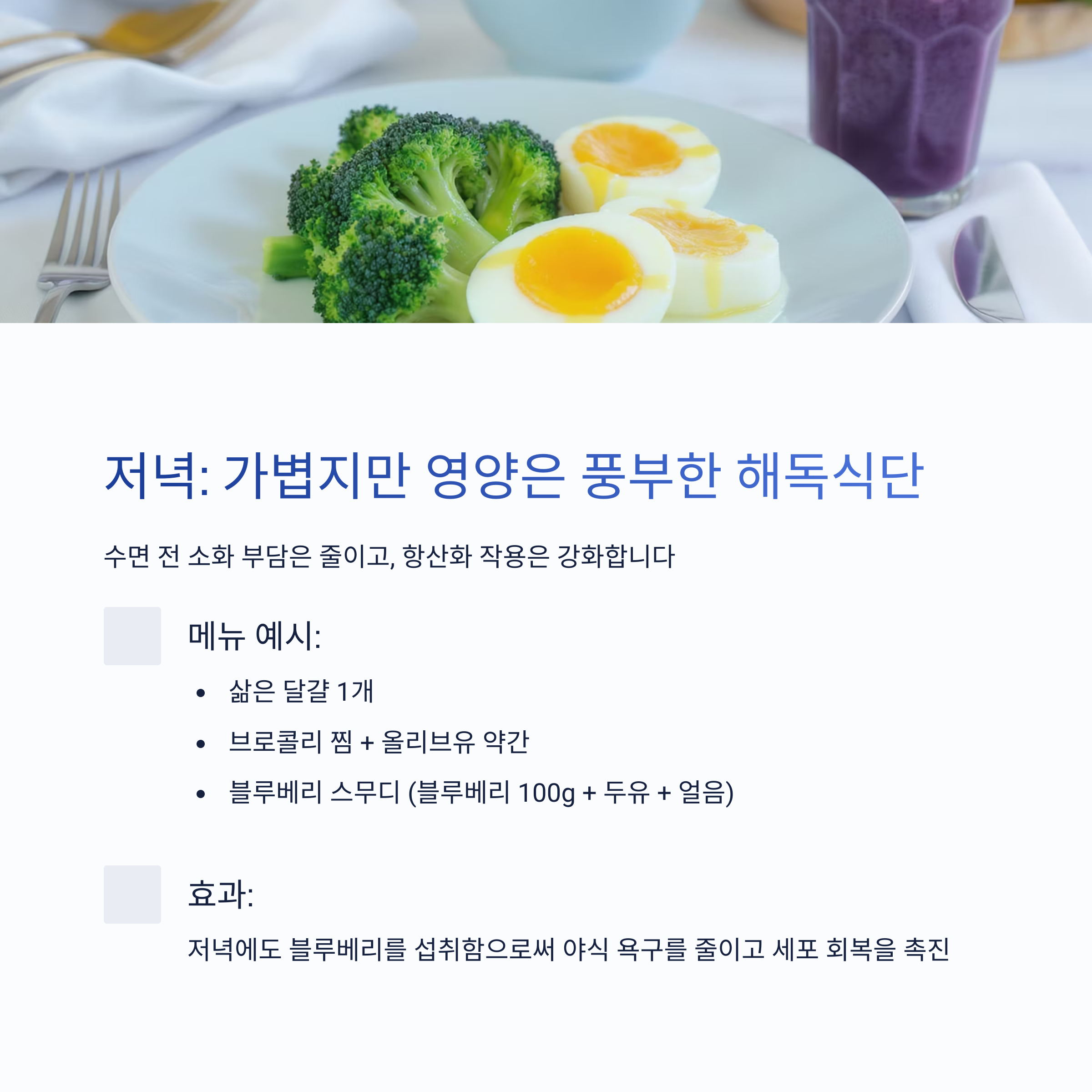 | 저녁 | 스무디 + 달걀 + 채소 | 해독, 야식 방지 |